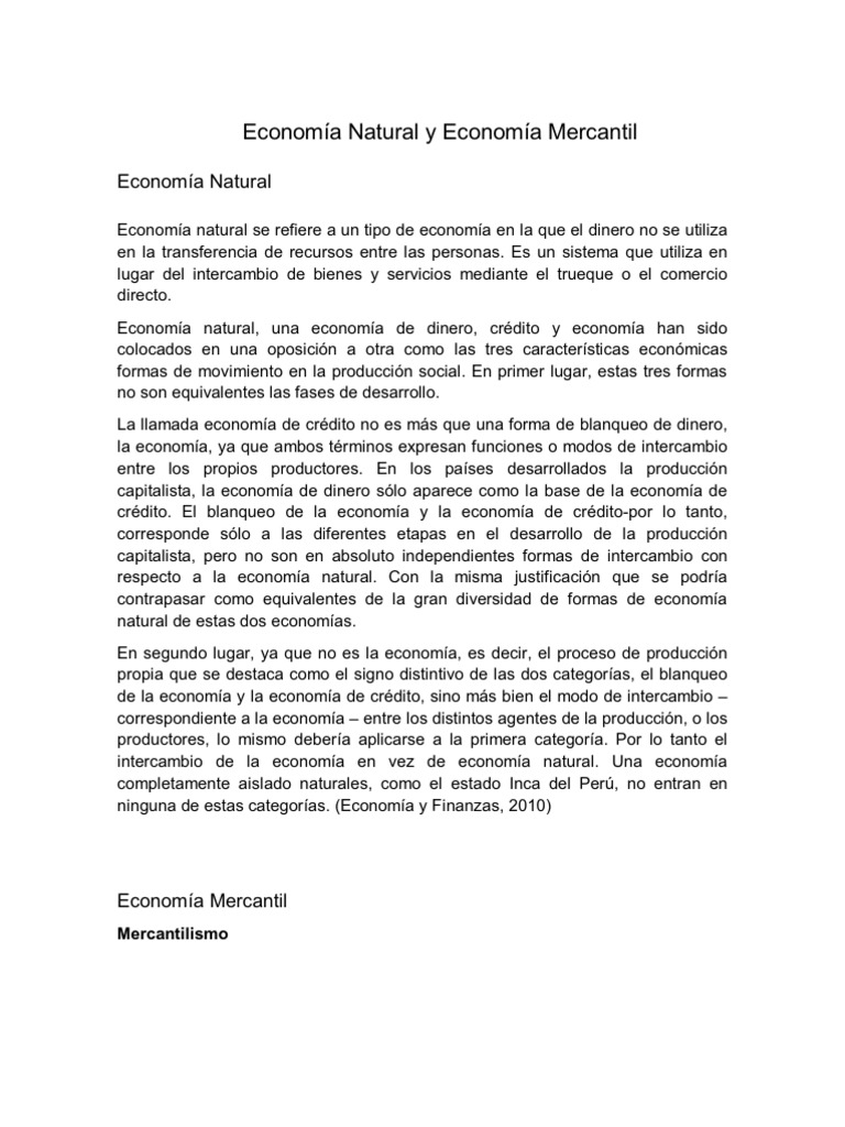 Economa natural se refiere a un tipo de economa en la que el dinero no se utiliza en la transferencia de recursos entre las personas. Es un sistema que utiliza en lugar del intercambio de bienes y servicios mediante el trueque o el comercio directo. Economa natural, una economa de dinero, crdito y economa han sido colocados en una oposicin a otra como las tres caractersticas econmicas formas de movimiento en la produccin social. En primer lugar, estas tres formas no son equivalentes las fases de desarrollo. La llamada economa de crdito no es ms que una forma de blanqueo de dinero, la economa, ya que ambos trminos expresan funciones o modos de intercambio entre los propios productores. En los pases desarrollados la produccin capitalista, la economa de dinero slo aparece como la base de la economa de crdito. El blanqueo de la economa y la economa de crdito-por lo tanto, corresponde slo a las diferentes etapas en el desarrollo de la produccin capitalista, pero no son en absoluto independientes formas de intercambio con respecto a la economa natural. Con la misma justificacin que se podra contrapasar como equivalentes de la gran diversidad de formas de economa natural de estas dos economas. En segundo lugar, ya que no es la economa, es decir, el proceso de produccin propia que se destaca como el signo distintivo de las dos categoras, el blanqueo de la economa y la economa de crdito, sino ms bien el modo de intercambio correspondiente a la economa entre los distintos agentes de la produccin, o los productores, lo mismo debera aplicarse a la primera categora. Por lo tanto el intercambio de la economa en vez de economa natural. Una economa completamente aislado naturales, como el estado Inca del Per, no entran en ninguna de estas categoras. (Economa y Finanzas, 2010)