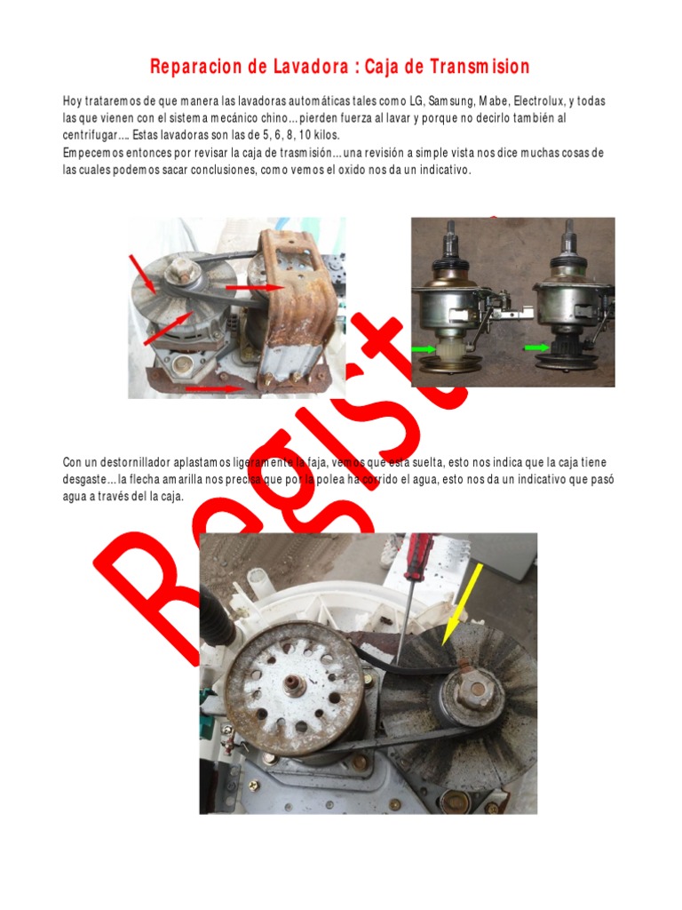 Hoy trataremos de que manera las lavadoras automticas tales como LG, Samsung, Mabe, Electrolux, y todas las que vienen con el sistema mecnico chino pierden fuerza al lavar y porque no decirlo tambin al centrifugar. Estas lavadoras son las de 5, 6, 8, 10 kilos. Empecemos entonces por revisar la caja de trasmisin una revisin a simple vista nos dice muchas cosas de las cuales podemos sacar conclusiones, como vemos el oxido nos da un indicativo.