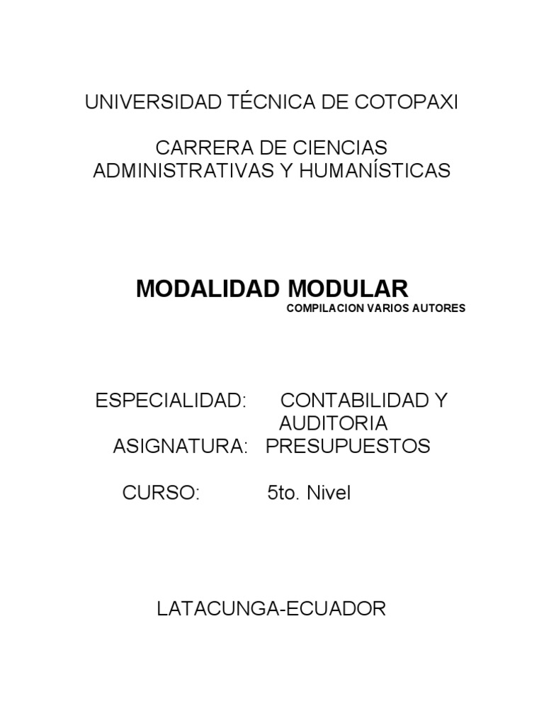 1.- INTRODUCCION El presente mdulo de estudio, est planificado de una manera didctica, con la finalidad de que los seores estudiantes puedan estudiar solos, desarrollar sus ejercicios que se encuentran en cada uno de los mdulos, para ello le sugiero hacer de estudiar cada uno de los temas que se encuentran planificados en las asesoras didcticas. El presente mdulo de encuentra estructurado en tres unidades cada unidad se estudio est planificada para estudiar en un parcial de siete semanas de estudio, en donde es estudiante encontrar todo lo que necesita para poder realizar el estudio bajo el sistema modular, el contenido del mdulo est compuesto con un 70% de lo que el estudiante debe leer y el 30% tendr que consultar en la bibliografa citada. En la unidad uno, est compuesto con toda la parte terica para que los alumnos se introduzcan al estudio de la planificacin y los presupuestos, en donde se detalla cada una de las herramientas a analizar en cada una empezando por la resea histrica, quienes son los nociones y usuarios de los presupuestos, como influye el presupuesto en la gerencia estratgica, la clasificacin de los presupuestos, la relacin del proceso administrativo y los presupuestos, etc. En la segunda unidad de estudio que corresponde al segundo parcial, con la planeacin del marketing y su influencia en los presupuestos comerciales, luego analizaremos los presupuestos de ventas, los modelos de pronsticos, como analizar el ambiente empresarial, los pasos para realizar presupuestos de ventas, como tambin los mtodos que se utiliza para pronosticar ventas con sus respectivos ejercicios, hasta llegar a estudiar el presupuesto de produccin. En la tercera y ltima unidad del mdulo, contiene a cerca del presupuesto de consumo y compra de materiales, el presupuesto de mano de obra directa, el de costos indirectos de fabricacin, el estado de costo de produccin y ventas, estado de resultados presupuestado, flujo de caja y balance general presupuestado, como tambin el anlisis financiero y el clculo del punto de equilibrio. Dentro del presente mdulo en cada unidad usted encontrar ejercicios desarrollados y propuestos con la finalidad de garantizar el proceso de enseanza aprendizaje de los estudiantes, al final tambin contiene la bibliografa necesaria para que el estudiante pueda reforzar sus conocimientos.