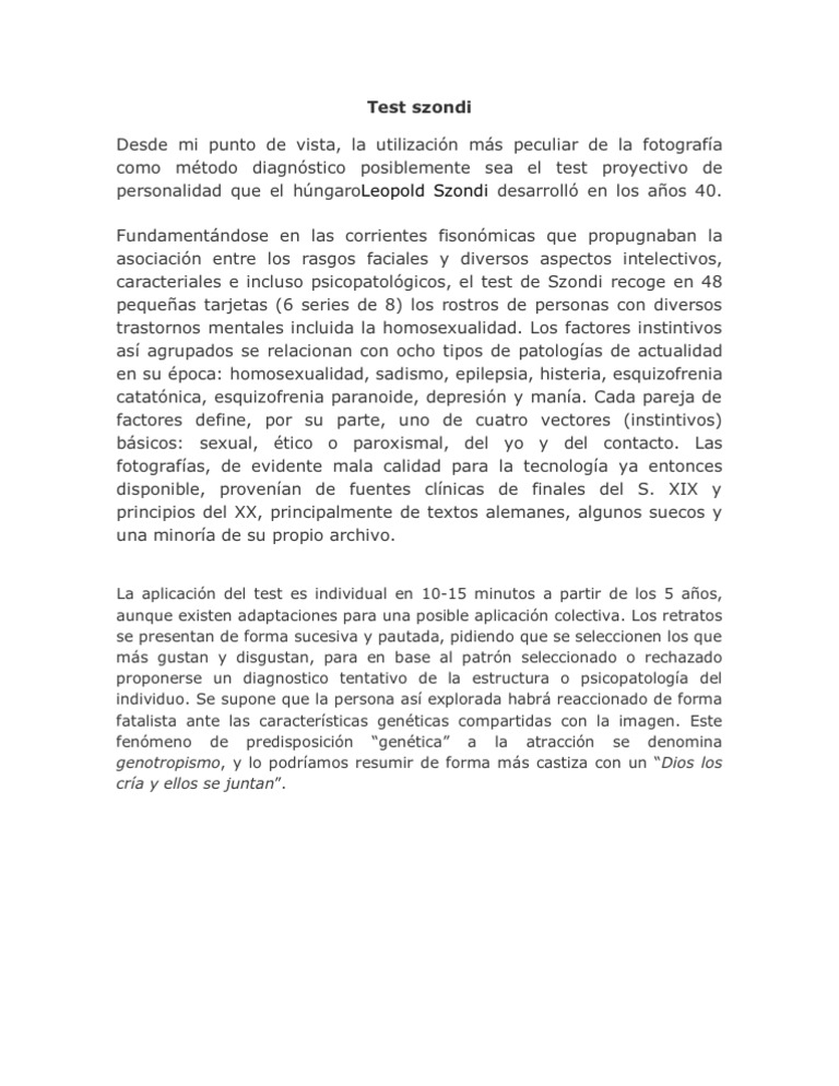Test szondi Desde mi punto de vista, la utilizacin ms peculiar de la fotografa como mtodo diagnstico posiblemente sea el test proyectivo