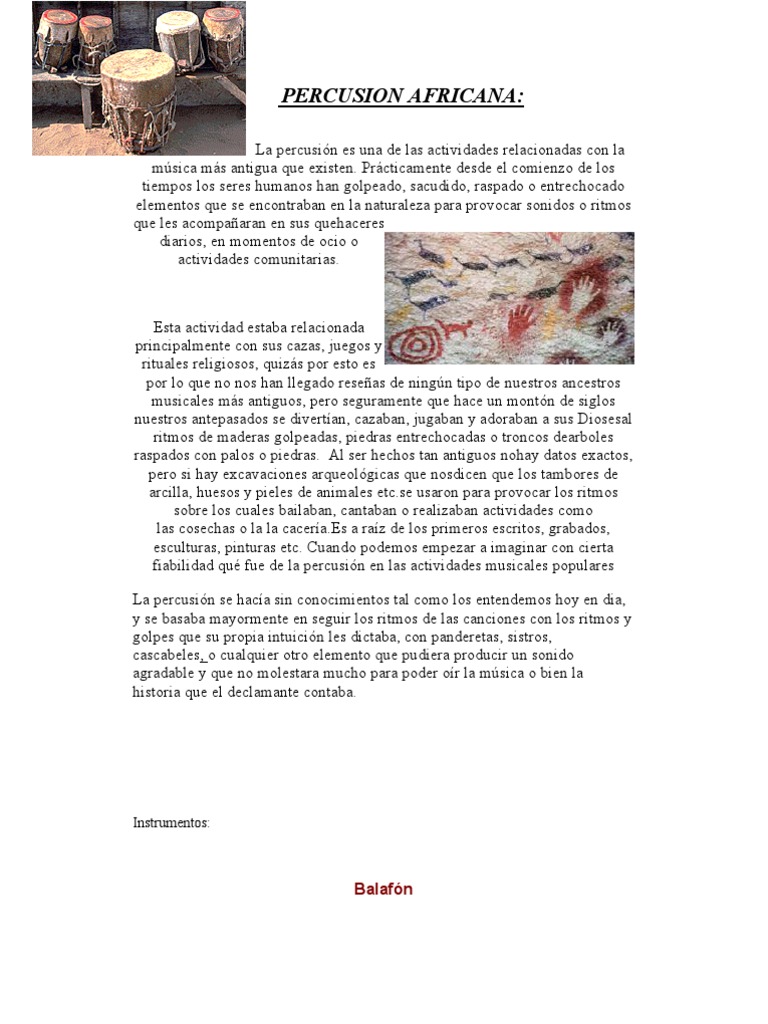 Esta actividad estaba relacionada principalmente con sus cazas, juegos y rituales religiosos, quizs por esto es por lo que no nos han llegado reseas de ningn tipo de nuestros ancestros musicales ms antiguos, pero seguramente que hace un montn de siglos nuestros antepasados se divertan, cazaban, jugaban y adoraban a sus Diosesal ritmos de maderas golpeadas, piedras entrechocadas o troncos dearboles raspados con palos o piedras. Al ser hechos tan antiguos nohay datos exactos, pero si hay excavaciones arqueolgicas que nosdicen que los tambores de arcilla, huesos y pieles de animales etc.se usaron para provocar los ritmos sobre los cuales bailaban, cantaban o realizaban actividades como las cosechas o la la cacera.Es a raz de los primeros escritos, grabados, esculturas, pinturas etc. Cuando podemos empezar a imaginar con cierta fiabilidad qu fue de la percusin en las actividades musicales populares La percusin se haca sin conocimientos tal como los entendemos hoy en dia, y se basaba mayormente en seguir los ritmos de las canciones con los ritmos y golpes que su propia intuicin les dictaba, con panderetas, sistros, cascabeles, o cualquier otro elemento que pudiera producir un sonido agradable y que no molestara mucho para poder or la msica o bien la historia que el declamante contaba.