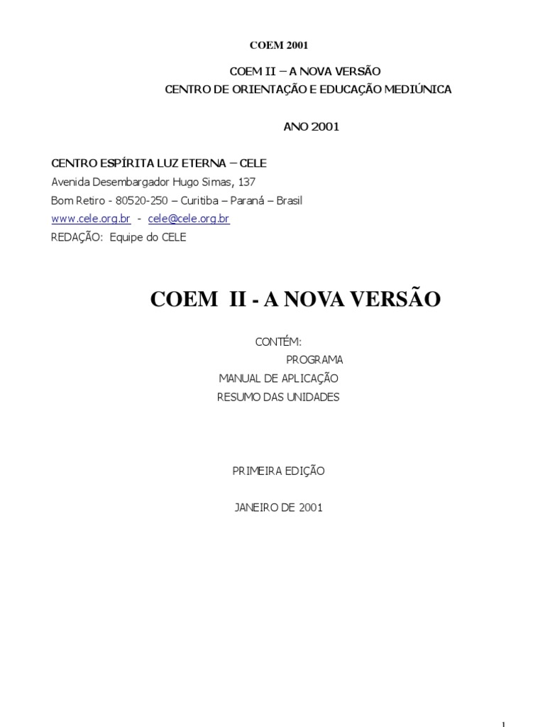 CONCLUSO A experincia do COEM tem se mostrado vlida conforme se pode concluir pelos resultados colhidos em vrios lugares do Brasil e de outros pases. Esta verso ora apresentada ao Movimento Esprita uma nova opo de sistemtica de aplicao do programa. A verso anterior continuar sendo editada, cabendo a cada Centro Esprita escolher entre aplic-lo de maneira extensiva, em dois anos, ou, desta forma, em que os contedos esto reunidos em apenas um perodo, destinando-se o segundo ano para um Estgio Experimental. Quando da primeira elaborao do COEM, nos idos de 1969, os confrades Alexandre Sech, Franklin Wagner e lvaro Borges, aps atenderem compromissos doutrinrios no Estado de So Paulo, estenderam sua viagem com o intuito de participarem da tradicional reunio das sextas-feiras na Comunho Esprita Crist de Uberaba. Aps a reunio, foram convidados a voltarem no dia seguinte, para reunio mais ntima. Na manh do dia 18 de maio de 1969 uma linda manh de sbado foram agraciados com a comunicao escrita pelas mos de Francisco Cndido Xavier e assinada por Bezerra, evidentemente o venervel esprito Dr. Adolpho Bezerra de Menezes, de tantas tradies doutrinrias em nosso meio. Alexandre Amigo, O Senhor nos abenoe. Em seu corao fraterno, dirigimo-nos aos companheiros de ideal e trabalho, a fim de nos reportarmos efetivamente aos imperativos do estudo. As tarefas programadas para que se veicule mais luz na direo da mediunidade sero supervisionadas por Mentores dignos e respeitveis que se encarregam da construo esprita crist no Paran. Sigamos adiante, buscando a inspirao da Vida Maior e plasmando-a no terreno das realidades objetivas que nos solicitam esforo e devotamento. Cremos que esse esprito de edificao que se esboa no campo da formao medinica em todos os setores alcanar crculos sempre mais amplos de nosso movimento, para que a necessria educao nos beneficie as comunidades de servio evanglico. A exploso dos fenmenos medinicos fato inconteste na atualidade em que a mquina oferece ao homem reservas quase que infinitas de tempo s cogitaes mentais. Isso, porm, nos obriga a verificar que a criatura terrestre, de modo geral, no se preparou devidamente para o emprego justo de semelhantes possibilidades nas reas do esprito. Conflitos da alma surgem por toda parte e o campo de influncias aberto entre encarnados e desencarnados nem sempre o mais feliz. Urge, dessa forma, aplicar Allan Kardec, isto , difundir-lhe os princpios na esfera da mediunidade para que os instrumentos da vida espiritual se afinem no preciso esclarecimento doutrinrio, de vez que sem o controle da Doutrina Esprita, o fenmeno medinico neutro em si mesmo -, pode estar merc de foras destrutivas, operando a perturbao ao invs da ordem, nas mos daqueles companheiros desencarnados que ainda se comprazem nos domnios da sombra.