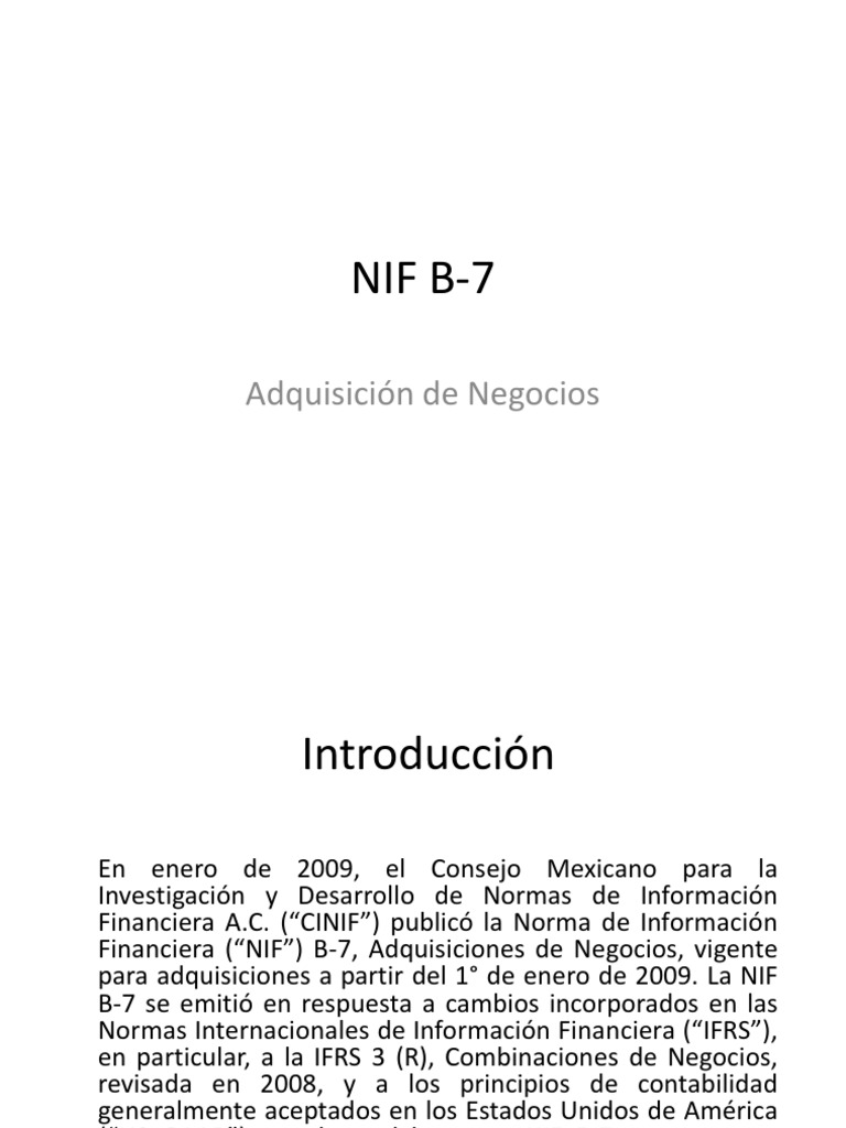La NIF B-7 se emiti en respuesta a cambios incorporados en las Normas Internacionales de Informacin Financiera ( IFRS ), en particular, a la IFRS 3 (R), Combinaciones de Negocios, revisada en 2008, y a los principios de contabilidad generalmente aceptados en los Estados Unidos de Amrica ( US GAAP ), por lo cual la nueva NIF B-7, converge en varios aspectos con dichas normatividades.