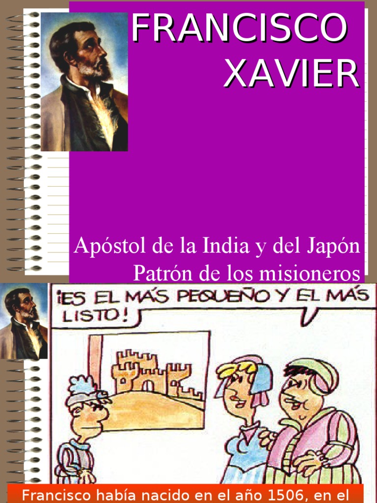 Patrón de los misioneros Francisco había nacido en el año 1506, en el castillo de Xavier, en Navarra. Su padre murió cuando él era todavía muy niño, así que tuvo que aprender a hacerse fuerte desde pequeño Navarra estaba en guerra con el rey de Castilla y los dos hermanos mayores tuvieron que irse a luchar. Francisco ayudaba a su madre, estudiaba y rezaba al Cristo de la Cuando la guerra terminó, los dos hermanos mayores propusieron a Francisco que se hiciera militar como ellos, pero el prefería estudiar para ser doctor en leyes como había Se fue a París para estudiar. Sacaba muy buenas notas y estaba seguro de que algún día conseguiría un empleo estupendo y ganaría mucho dinero y, sobre todo, muchos En la universidad de París, que se llama Sorbona, Francisco conoció a muchos estudiantes, y entre ellos, a Ignacio de Loyola, un vasco por el que, al principio, no sintió Más tarde, consiguió su título universitario, se hizo muy amigo de Ignacio y de otros estudiantes; fue con ellos a Roma, todos se ordenaron sacerdotes y fundaron la Compañía El rey de Portugal, Juan III, que poseía muchos territorios en la India y más allá, quería que Ignacio enviase a alguno de los suyos como misionero a aquellas tierras. Ignacio mandó a Francisco, que fue encantado, porque hacía tiempo que soñaba con ser misionero y trabajar mucho para hablar de Dios a todas las gentes que no le conocían. Viajó de Roma a Portugal, y de allí a la India. De Lisboa a Goa tardó trece meses. En Goa trabajó con los niños y los enfermos. Después predicó y sirvió a los Viajó hasta más allá de Malaca para seguir enseñando y bautizando en todos los lugares del imperio portugués. Nunca le parecía haber trabajado bastante para En Malaca, un japonés llamado Anjiró le habló de su patria, y Francisco decidió llegar hasta allí para evangelizar aquel país al que casi ningún europeo había llegado todavía. Fundó misiones en el Japón, y se propuso llegar hasta China. Murió cuando estaba próximo a entrar en China. Murió a los 46 años, habiendo gastado su vida al servicio del FRANCISCO XAVIER A partir de ahora, las diapositivas serán con preguntas, para ver qué cosas sabes de S. Francisco Xavier. Al principio de llegar a Al principio Goa, Xavier de llegar a trabajó con Goa, Xavier los niños y trabajó con enfermos. Al principio los de llegar a sacerdotes Goa, Xavier hindúes. trabajó con los soldados portugueses . Viajó a las Malacas, Viajó a para seguir China, predicando para y predicar bautizando allí el . Viajó a Lisboa Evangeli para pedir o. ayuda al rey de Portugal.. Murió a los 46 años, Murió a los habiendo gastado 46 años, su vida al servicio habiendo del Señor por los gastado países de Oriente. su vida en hacer grandes Murió a los 46 años, estudios y habiendo gastado en escribir su vida en anunciar libros. el Evangelio en los países de América. FRANCISCO XAVIER FIN