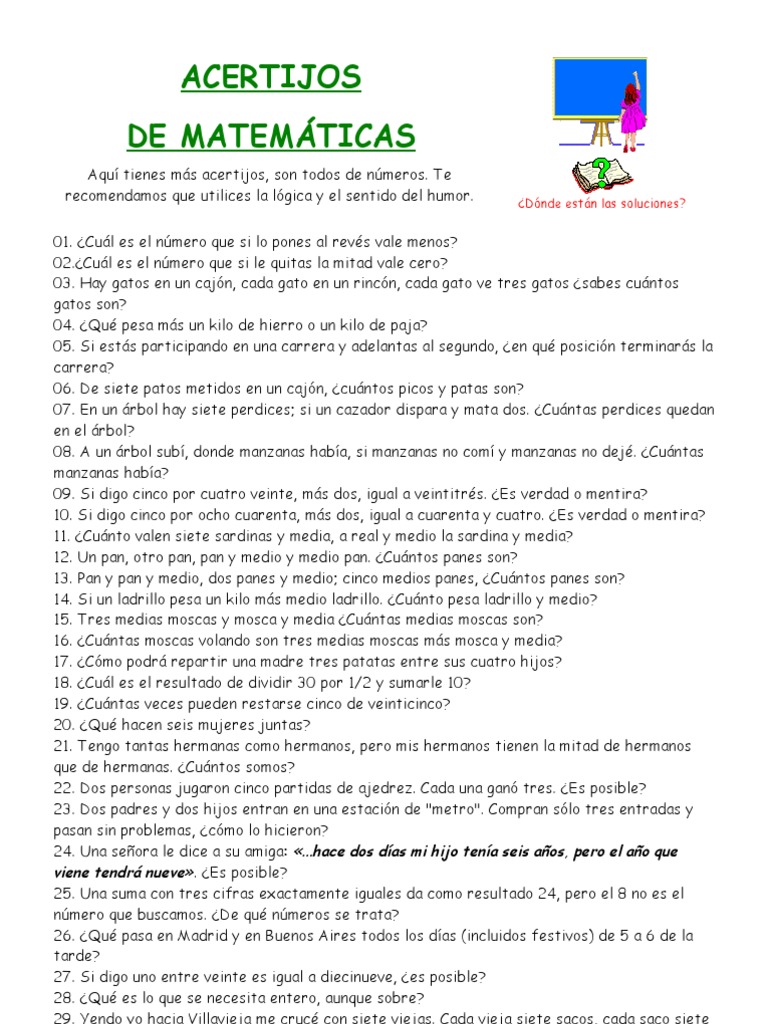 01. Cul es el nmero que si lo pones al revs vale menos? 02.Cul es el nmero que si le quitas la mitad vale cero? 03. Hay gatos en un cajn, cada gato en un rincn, cada gato ve tres gatos sabes cuntos gatos son? 04. Qu pesa ms un kilo de hierro o un kilo de paja? 05. Si ests participando en una carrera y adelantas al segundo, en qu posicin terminars la carrera? 06. De siete patos metidos en un cajn, cuntos picos y patas son? 07. En un rbol hay siete perdices; si un cazador dispara y mata dos. Cuntas perdices quedan en el rbol? 08. A un rbol sub, donde manzanas haba, si manzanas no com y manzanas no dej. Cuntas manzanas haba? 09. Si digo cinco por cuatro veinte, ms dos, igual a veintitrs. Es verdad o mentira? 10. Si digo cinco por ocho cuarenta, ms dos, igual a cuarenta y cuatro. Es verdad o mentira? 11. Cunto valen siete sardinas y media, a real y medio la sardina y media? 12. Un pan, otro pan, pan y medio y medio pan. Cuntos panes son? 13. Pan y pan y medio, dos panes y medio; cinco medios panes, Cuntos panes son? 14. Si un ladrillo pesa un kilo ms medio ladrillo. Cunto pesa ladrillo y medio? 15. Tres medias moscas y mosca y media Cuntas medias moscas son? 16. Cuntas moscas volando son tres medias moscas ms mosca y media? 17. Cmo podr repartir una madre tres patatas entre sus cuatro hijos? 18. Cul es el resultado de dividir 30 por 1/2 y sumarle 10? 19. Cuntas veces pueden restarse cinco de veinticinco? 20. Qu hacen seis mujeres juntas? 21. Tengo tantas hermanas como hermanos, pero mis hermanos tienen la mitad de hermanos que de hermanas. Cuntos somos? 22. Dos personas jugaron cinco partidas de ajedrez. Cada una gan tres. Es posible? 23. Dos padres y dos hijos entran en una estacin de "metro". Compran slo tres entradas y pasan sin problemas, cmo lo hicieron? 24. Una seora le dice a su amiga: ...hace dos das mi hijo tena seis aos, pero el ao que viene tendr nueve. Es posible? 25. Una suma con tres cifras exactamente iguales da como resultado 24, pero el 8 no es el nmero que buscamos. De qu nmeros se trata? 26. Qu pasa en Madrid y en Buenos Aires todos los das (incluidos festivos) de 5 a 6 de la tarde? 27. Si digo uno entre veinte es igual a diecinueve, es posible? 28. Qu es lo que se necesita entero, aunque sobre? 29. Yendo yo hacia Villavieja me cruc con siete viejas. Cada vieja siete sacos, cada saco siete ovejas. Cuntas viejas, sacos y ovejas iban hacia Villavieja? 30. Si dos regalos cuestan 110 euros y uno de ellos cuesta 100 euros ms que el otro, cunto vale cada regalo? 31. Un agricultor tiene 3 montones de paja en el prado y 4 montones en el pajar. Si los juntara todos cuntos montones tendra? 32. En el cajn de tu armario tienes seis calcetines negros y seis calcetines azules. Si no hay