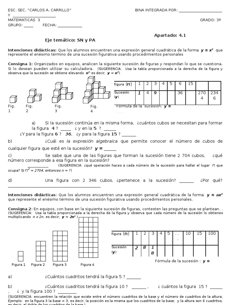 Intenciones didcticas: Que los alumnos encuentren una expresin general cuadrtica de la forma y = x2 que represente el ensimo trmino de una sucesin figurativa usando procedimientos personales Consigna 1: Organizados en equipos, analicen la siguiente sucesin de figuras y respondan lo que se cuestiona. Si lo desean pueden utilizar su calculadora. (SUGERENCIA: Usa la tabla proporcionada a la derecha de la figura y