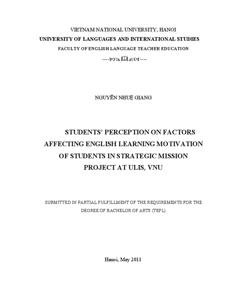 STUDENTS PERCEPTION ON FACTORS AFFECTING ENGLISH LEARNING MOTIVATION OF STUDENTS IN STRATEGIC MISSION PROJECT AT ULIS, VNU