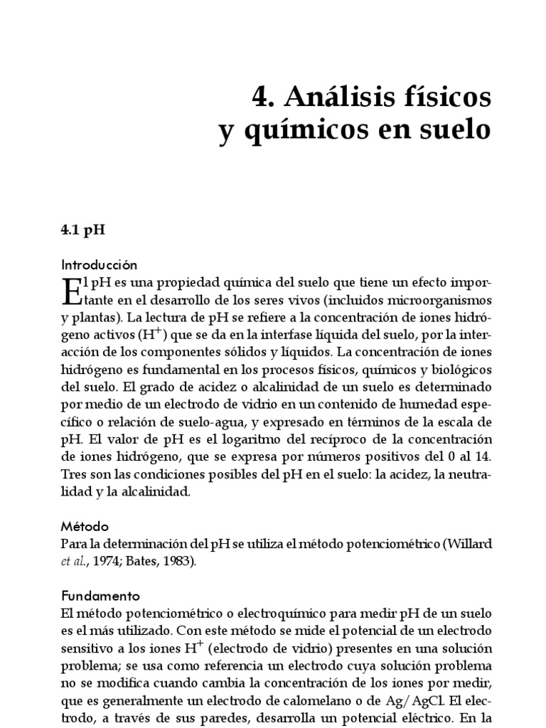 Mtodo Para la determinacin del pH se utiliza el mtodo potenciomtrico (Willard et al., 1974; Bates, 1983). Fundamento El mtodo potenciomtrico o electroqumico para medir pH de un suelo es el ms utilizado. Con este mtodo se mide el potencial de un electrodo sensitivo a los iones H+ (electrodo de vidrio) presentes en una solucin problema; se usa como referencia un electrodo cuya solucin problema no se modifica cuando cambia la concentracin de los iones por medir, que es generalmente un electrodo de calomelano o de Ag/AgCl. El electrodo, a travs de sus paredes, desarrolla un potencial elctrico. En la prctica se utilizan soluciones amortiguadoras, de pH conocido, para