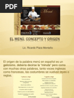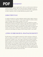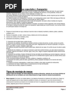 El documento proporciona instrucciones detalladas sobre el montaje correcto de la mesa para desayunos, almuerzos, cenas formales y otras comidas. Explica dónde colocar cada elemento de cubertería, vajilla y cristalería de acuerdo con los estándares de servicio. Asimismo, ofrece consejos sobre la decoración y presentación general de la mesa para diferentes tipos de reuniones.