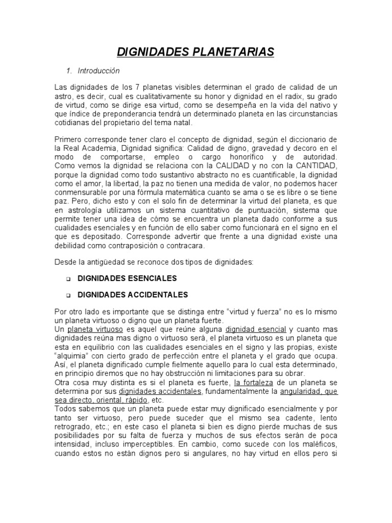 1. Introduccin Las dignidades de los 7 planetas visibles determinan el grado de calidad de un astro, es decir, cual es cualitativamente su honor y dignidad en el radix, su grado de virtud, como se dirige esa virtud, como se desempea en la vida del nativo y que ndice de preponderancia tendr un determinado planeta en las circunstancias cotidianas del propietario del tema natal. Primero corresponde tener claro el concepto de dignidad, segn el diccionario de la Real Academia, Dignidad significa: Calidad de digno, gravedad y decoro en el modo de comportarse, empleo o cargo honorfico y de autoridad. Como vemos la dignidad se relaciona con la CALIDAD y no con la CANTIDAD, porque la dignidad como todo sustantivo abstracto no es cuantificable, la dignidad como el amor, la libertad, la paz no tienen una medida de valor, no podemos hacer conmensurable por una frmula matemtica cuanto se ama o se es libre o se tiene paz. Pero, dicho esto y con el solo fin de determinar la virtud del planeta, es que en astrologa utilizamos un sistema cuantitativo de puntuacin, sistema que permite tener una idea de cmo se encuentra un planeta dado conforme a sus cualidades esenciales y en funcin de ello saber como funcionar en el signo en el que es depositado. Corresponde advertir que frente a una dignidad existe una debilidad como contraposicin o contracara. Desde la antigedad se reconoce dos tipos de dignidades:
