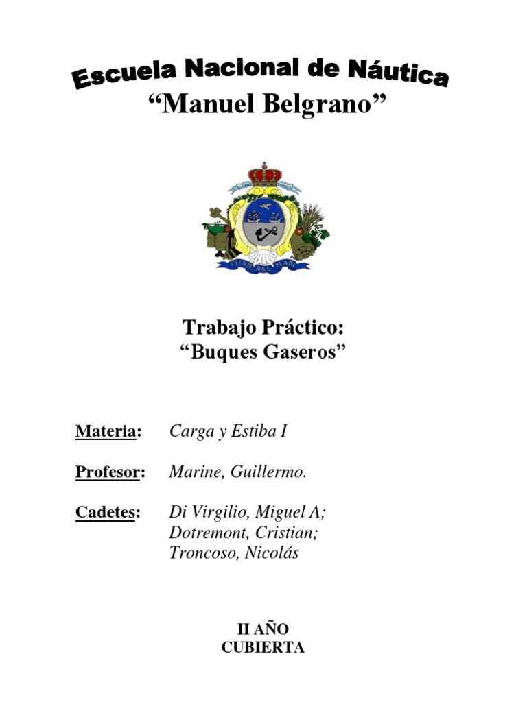 TRABAJO PRACTICO BUQUES GASEROS 1) Introduccin. 2) Definiciones generales acerca de gases. 3) Transformacin del gas a gas licuado. 4) LNG. 5) LPG. 6) Explosividad de los gases en el aire y otros riesgos. 7) Tipos de buques gaseros. 8) Diferentes formas existentes para la contencin de la carga 9) Tipos de tanques. 10) Tipos de buques gaseros segn normas de seguridad. 11) Sistemas y elementos que intervienen en el proceso de carga y descarga. 12) Sistemas de contencin. 13) Sistemas de carga, operaciones, manipulacin, lnea de vapores, recirculacin de la fase liquida, intertizacion. 14) Proceso de carga. 15) Embarque del GNL. 16) Finalizacin de la carga. 17) Transporte del GNL. 18) Descarga del GNL. 19) Proceso de descarga. 20) Finalizacin de la descarga.