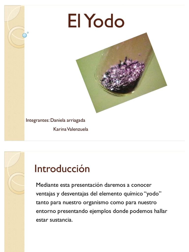 Mediante esta presentacin daremos a conocer ventajas y desventajas del elemento qumico yodo tanto para nuestro organismo como para nuestro entorno presentando ejemplos donde podemos hallar estar sustancia.