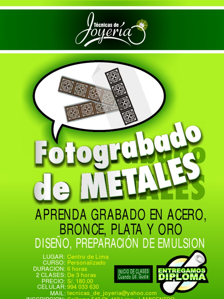 LUGAR: Centro de Lima CURSO: Personalizado DURACION: 6 horas INICIO DE CLASES 2 CLASES: De 3 horas Cuando Ud. Guste PRECIO: S/. 180.00 CELULAR: 994 033 630 MAIL: tecnicas_de_joyeria@yahoo.com INSCRIPCION: Cailloma 543 Of. 112 Lima - LAMICENTRO