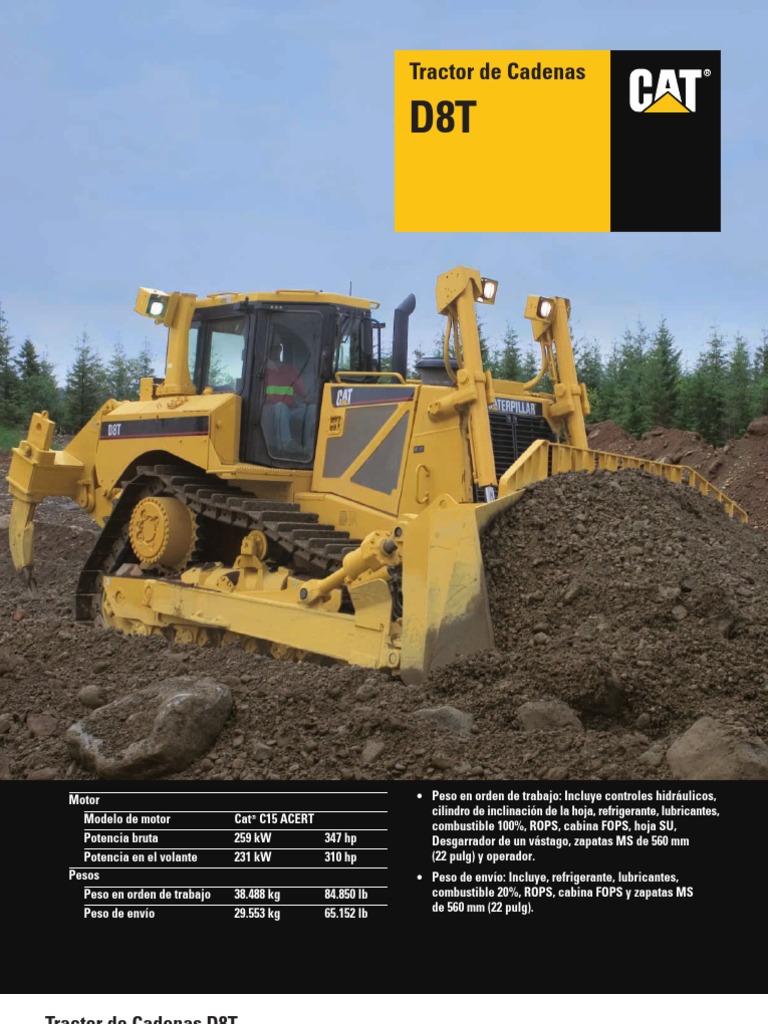 Diseado para trabajos exigentes. La construccin duradera del D8T es ideal para trabajar en condiciones difciles. El motor C15 de rendimiento superior y bajo consumo de combustible, que cumple con las regulaciones de emisiones con la ayuda de la tecnologa ACERT, mantiene el material en movimiento con la fiabilidad y los bajos costos de operacin que usted espera de los Tractores Cat.