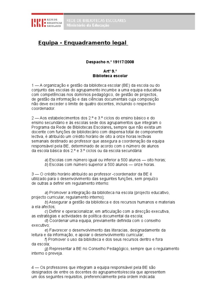 especificamente para a biblioteca escolar, deverá fazer parte da equipa da escola sede.