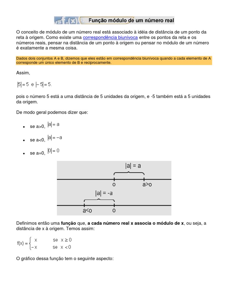 Definimos ento uma funo que, a cada nmero real x associa o mdulo de x, ou seja, a distncia de x origem. Temos assim:
