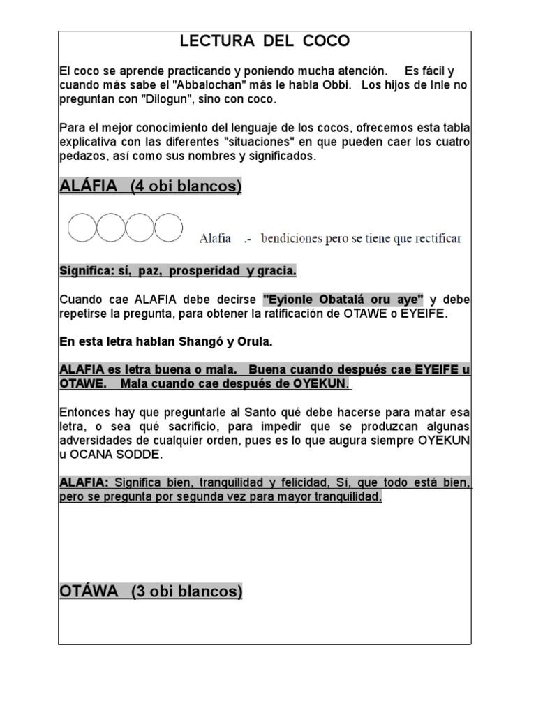 El coco se aprende practicando y poniendo mucha atencin. Es fcil y cuando ms sabe el "Abbalochan" ms le habla Obbi. Los hijos de Inle no preguntan con "Dilogun", sino con coco. Para el mejor conocimiento del lenguaje de los cocos, ofrecemos esta tabla explicativa con las diferentes "situaciones" en que pueden caer los cuatro pedazos, as como sus nombres y significados.