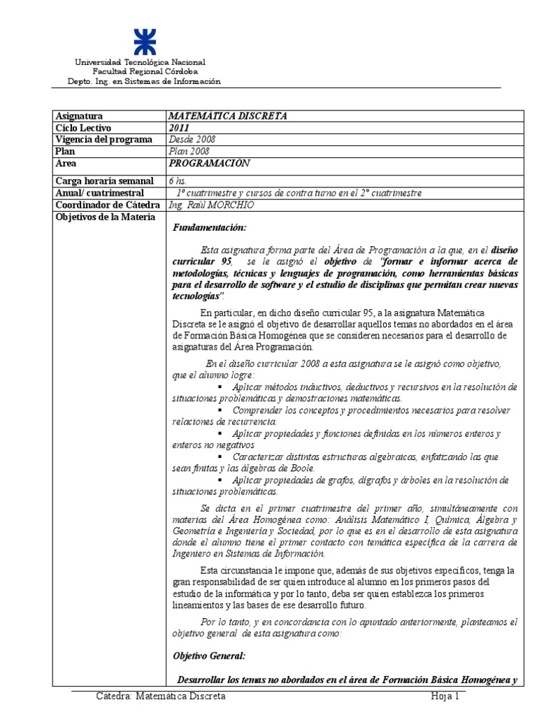 6 hs. Carga horaria semanal 1 cuatrimestre y cursos de contra turno en el 2 cuatrimestre Anual/ cuatrimestral Coordinador de Ctedra Ing. Ral MORCHIO Objetivos de la Materia Fundamentacin: Esta asignatura forma parte del rea de Programacin a la que, en el diseo curricular 95, se le asign el objetivo de "formar e informar acerca de metodologas, tcnicas y lenguajes de programacin, como herramientas bsicas para el desarrollo de software y el estudio de disciplinas que permitan crear nuevas tecnologas". En particular, en dicho diseo curricular 95, a la asignatura Matemtica Discreta se le asign el objetivo de desarrollar aquellos temas no abordados en el rea de Formacin Bsica Homognea que se consideren necesarios para el desarrollo de asignaturas del rea Programacin. En el diseo curricular 2008 a esta asignatura se le asign como objetivo, que el alumno logre: Aplicar mtodos inductivos, deductivos y recursivos en la resolucin de situaciones problemticas y demostraciones matemticas. Comprender los conceptos y procedimientos necesarios para resolver relaciones de recurrencia. Aplicar propiedades y funciones definidas en los nmeros enteros y enteros no negativos Caracterizar distintas estructuras algebraicas, enfatizando las que sean finitas y las lgebras de Boole. Aplicar propiedades de grafos, dgrafos y rboles en la resolucin de situaciones problemticas. Se dicta en el primer cuatrimestre del primer ao, simultneamente con materias del rea Homognea como: Anlisis Matemtico I, Qumica, lgebra y Geometra e Ingeniera y Sociedad, por lo que es en el desarrollo de esta asignatura donde el alumno tiene el primer contacto con temtica especfica de la carrera de Ingeniero en Sistemas de Informacin. Esta circunstancia le impone que, adems de sus objetivos especficos, tenga la gran responsabilidad de ser quien introduce al alumno en los primeros pasos del estudio de la informtica y por lo tanto, deba ser quien establezca los primeros lineamientos y las bases de ese desarrollo futuro. Por lo tanto, y en concordancia con lo apuntado anteriormente, planteamos el objetivo general de esta asignatura como: Objetivo General: Desarrollar los temas no abordados en el rea de Formacin Bsica Homognea y