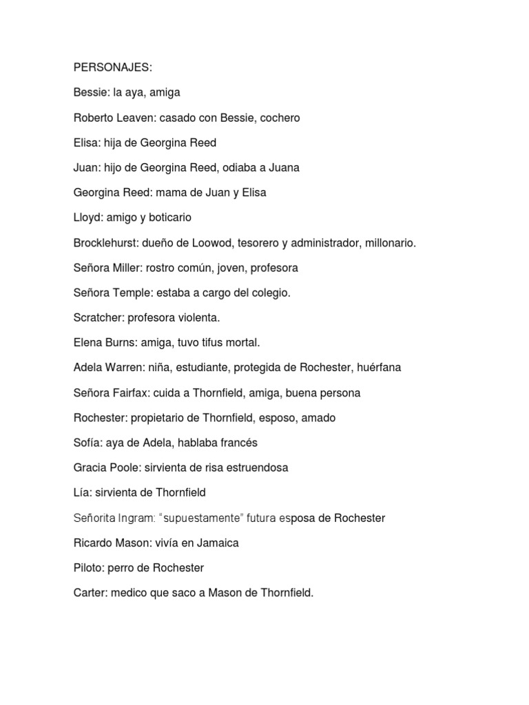 hijo de Georgina Reed, odiaba a Juana Georgina Reed: mama de Juan y Elisa Lloyd: amigo y boticario Brocklehurst: dueo de Loowod, tesorero y administrador, millonario. Seora Miller: rostro comn, joven, profesora Seora Temple: estaba a cargo del colegio. Scratcher: profesora violenta. Elena Burns: amiga, tuvo tifus mortal. Adela Warren: nia, estudiante, protegida de Rochester, hurfana Seora Fairfax: cuida a Thornfield, amiga, buena persona Rochester: propietario de Thornfield, esposo, amado Sofa: aya de Adela, hablaba francs Gracia Poole: sirvienta de risa estruendosa La: sirvienta de Thornfield Seorita Ingram: supuestamente futura esposa de Rochester Ricardo Mason: viva en Jamaica Piloto: perro de Rochester Carter: medico que saco a Mason de Thornfield.