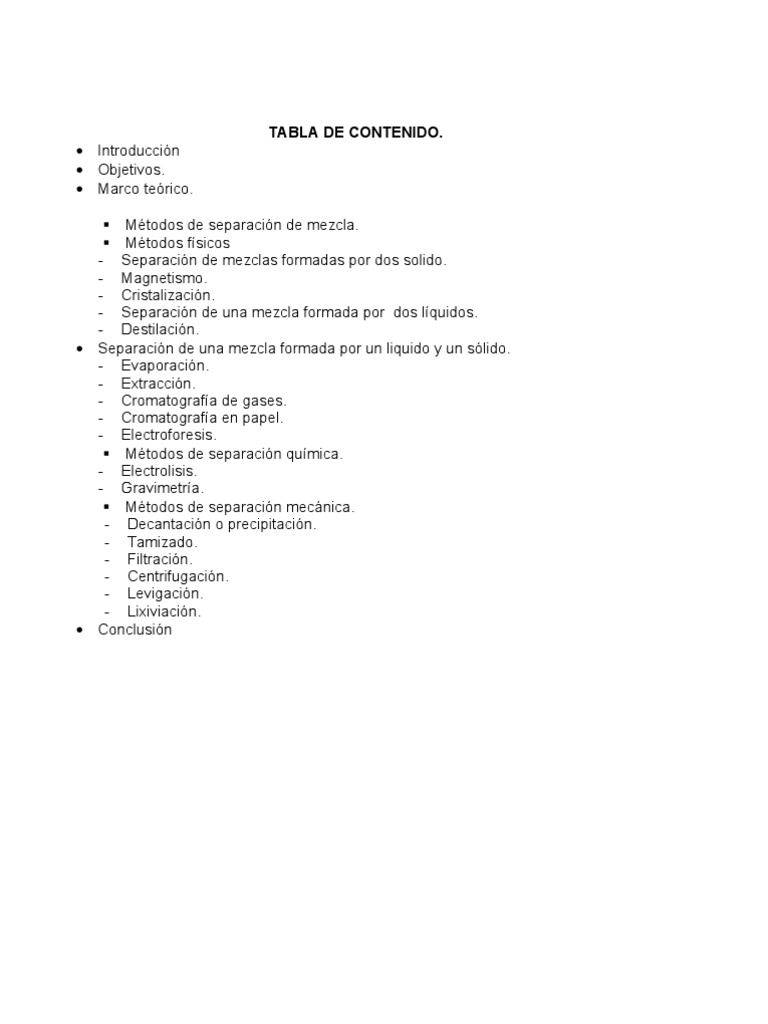 TABLA DE CONTENIDO. Introduccin Objetivos. Marco terico. Mtodos de separacin de mezcla.