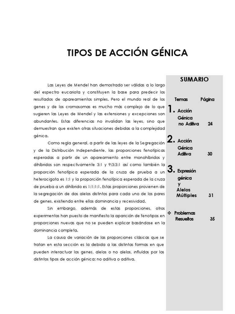 Las Leyes de Mendel han demostrado ser vlidas a lo largo del espectro eucariota y constituyen la base para predecir los resultados de apareamientos simples. Pero el mundo real de los genes y de los cromosomas es mucho ms complejo de lo que sugieren las Leyes de Mendel y las extensiones y excepciones son abundantes. Estas diferencias no invalidan las leyes, sino que demuestran que existen otras situaciones debidas a la complejidad gnica. Como regla general, a partir de las leyes de la Segregacin y de la Distribucin Independiente, las proporciones fenotpicas esperadas a partir de un apareamiento entre monohbridos y dihbridos son respectivamente 3:1 y 9:3:3:1 as como tambin la proporcin fenotpica esperada de la cruza de prueba a un heterocigota es 1:1 y la proporcin fenotpica esperada de la cruza de prueba a un dihbrido es 1:1:1:1. Estas proporciones provienen de la segregacin de dos alelos distintos para cada uno de los pares de genes, existiendo entre ellos dominancia y recesividad. Sin embargo, adems de estas proporciones, otros experimentos han puesto de manifiesto la aparicin de fenotipos en proporciones nuevas que no se pueden explicar basndose en la dominancia completa. La causa de variacin de las proporciones clsicas que se tratan en esta seccin es la debida a las distintas formas en que pueden interactuar los genes, alelos o no alelos, infludos por los distintos tipos de accin gnica: no aditiva o aditiva.