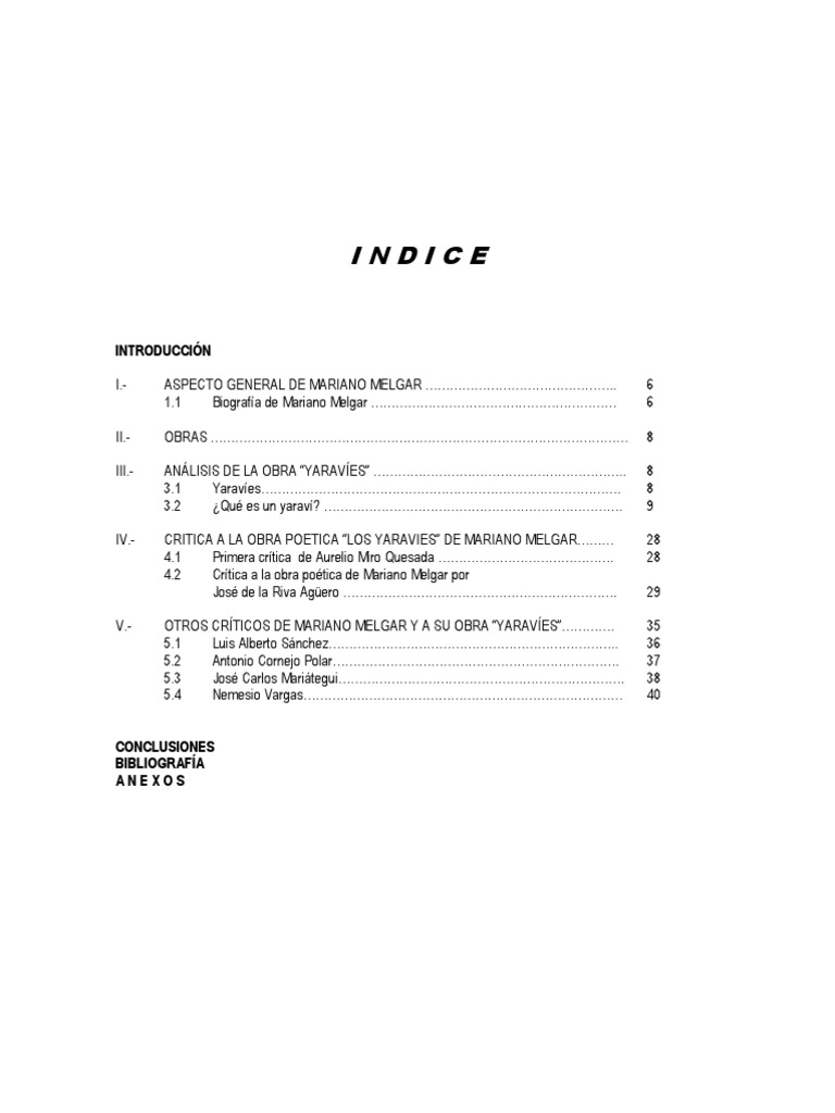INTRODUCCIN I.II.III.ASPECTO GENERAL DE MARIANO MELGAR .. 1.1 Biografa de Mariano Melgar OBRAS ANLISIS DE LA OBRA YARAVES .. 3.1 Yaraves. 3.2 Qu es un yarav? . CRITICA A LA OBRA POETICA LOS YARAVIES DE MARIANO MELGAR 4.1 Primera crtica de Aurelio Miro Quesada . 4.2 Crtica a la obra potica de Mariano Melgar por Jos de la Riva Agero . OTROS CRTICOS DE MARIANO MELGAR Y A SU OBRA YARAVES. 5.1 Luis Alberto Snchez.. 5.2 Antonio Cornejo Polar. 5.3 Jos Carlos Maritegui. 5.4 Nemesio Vargas 6 6 8 8 8 9 28 28 29 35 36 37 38 40