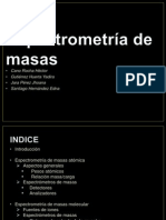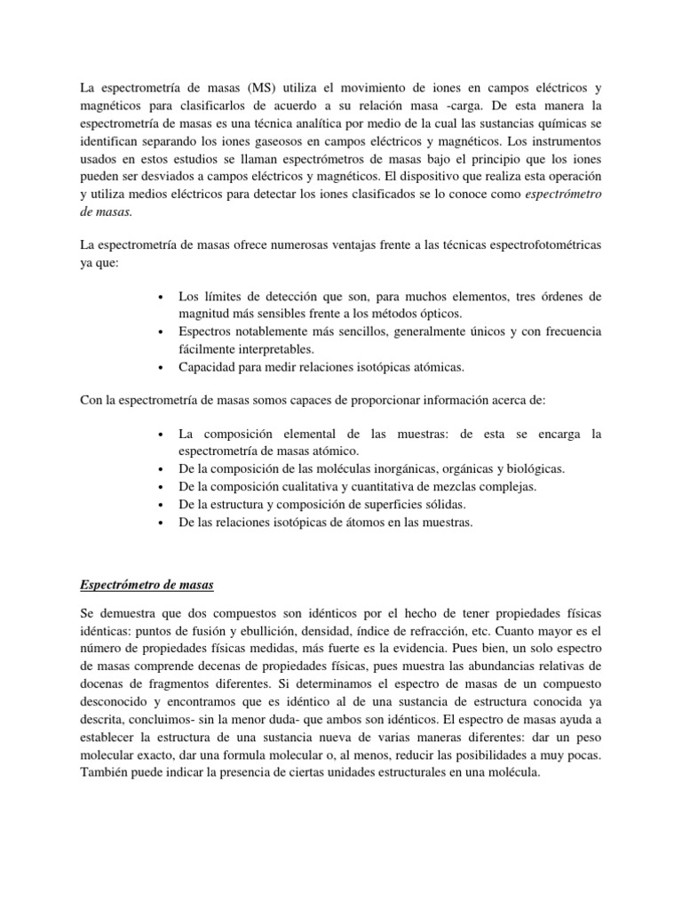 Espectrmetro de masas Se demuestra que dos compuestos son idnticos por el hecho de tener propiedades fsicas idnticas: puntos de fusin y ebullicin, densidad, ndice de refraccin, etc. Cuanto mayor es el nmero de propiedades fsicas medidas, ms fuerte es la evidencia. Pues bien, un solo espectro de masas comprende decenas de propiedades fsicas, pues muestra las abundancias relativas de docenas de fragmentos diferentes. Si determinamos el espectro de masas de un compuesto desconocido y encontramos que es idntico al de una sustancia de estructura conocida ya descrita, concluimos- sin la menor duda- que ambos son idnticos. El espectro de masas ayuda a establecer la estructura de una sustancia nueva de varias maneras diferentes: dar un peso molecular exacto, dar una formula molecular o, al menos, reducir las posibilidades a muy pocas. Tambin puede indicar la presencia de ciertas unidades estructurales en una molcula.