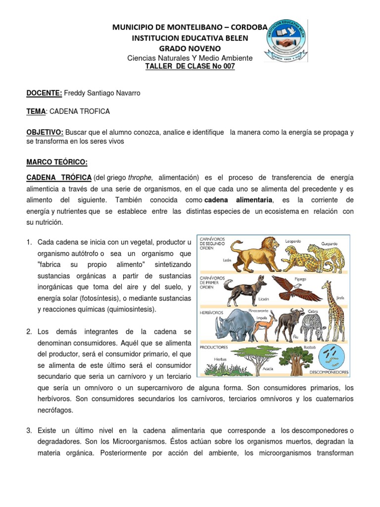 DOCENTE: Freddy Santiago Navarro TEMA: CADENA TROFICA OBJETIVO: Buscar que el alumno conozca, analice e identifique la manera como la energa se propaga y se transforma en los seres vivos MARCO TERICO: CADENA TRFICA (del griego throphe, alimentacin) es el proceso de transferencia de energa alimenticia a travs de una serie de organismos, en el que cada uno se alimenta del precedente y es alimento del siguiente. Tambin conocida como cadena alimentaria, es la corriente de energa y nutrientes que se establece entre las distintas especies de un ecosistema en relacin con su nutricin. 1. Cada cadena se inicia con un vegetal, productor u organismo auttrofo o sea un organismo que "fabrica su propio alimento" sintetizando sustancias orgnicas a partir de sustancias inorgnicas que toma del aire y del suelo, y energa solar (fotosntesis), o mediante sustancias y reacciones qumicas (quimiosintesis). 2. Los dems integrantes de la cadena se