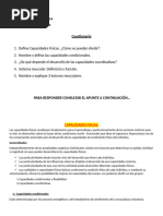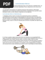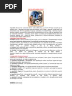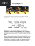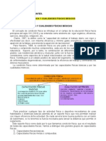 CONCEPTO DE CAPACIDADES FSICAS: Podemos definir las capacidades fsicas bsicas como: los factores que determinan la condicin fsica del individuo, que lo orientan hacia la realizacin de una determinada actividad fsica y posibilitan el desarrollo de su potencial fsico mediante su entrenamiento lvarez del Villar. Son condicionales por varias razones: a) se desarrollan mediante el proceso de acondicionamiento fsico b) condicionan el rendimiento deportivo Estas capacidades se dicen que son bsicas porque son las componentes de las dems cualidades que se denominan resultantes y porque son el soporte fsico de las cualidades ms complejas. 2. CLASIFICACIN DE LAS CAPACIDADES FSICAS. Muchos autores de pocas pasadas han mencionado en sus tratados o libros las capacidades fsicas. Dentro de estas capacidades fsicas la mayora los dividan en: ejercicios de fuerza, de velocidad, de resistencia, de destreza, etc.; e incluso llegaron a mencionar otras cualidades como: el equilibrio, la habilidad, la flexibilidad, la agilidad, etc. Uno de los autores fue Gundlack (1968) el cual clasifica las capacidades fsicas en: Capacidades condicionales: que vienen determinadas por los procesos energticos y metablicos de rendimiento de la musculatura voluntaria: fuerza, velocidad, resistencia. Capacidades intermedias: flexibilidad, reaccin motriz simple,.. Capacidades coordinativas, que vienen determinadas por los procesos de direccin del sistema nervioso central: equilibrio, agilidad, coordinacin, etc. En la actualidad la mayora de los autores coinciden en denominar capacidades fsicas bsicas a la resistencia, fuerza, velocidad y la flexibilidad, no incluyendo en esta clasificacin a la coordinacin debido a que entrara a formar parte de las capacidades psicomotoras o coordinativas. Hay que tener en cuenta que debe verse al hombre/mujer como un todo y por ello cualquier acto motor que realice es el resultado de la participacin conjunta de todas las capacidades que posee el individuo. Distintas circunstancias se dan en los fenmenos fisiolgicos que respaldan estas Capacidades. Mientras que la fuerza, la resistencia, la velocidad y la flexibilidad Recaen Fundamentalmente sobre la accin muscular, metablica cardiovascular; la Coordinacin lo hace sobre proceso de control motor (sistema nervioso), lo que no Quiere decir que no estn perfectamente interrelaciones y sean inseparables.