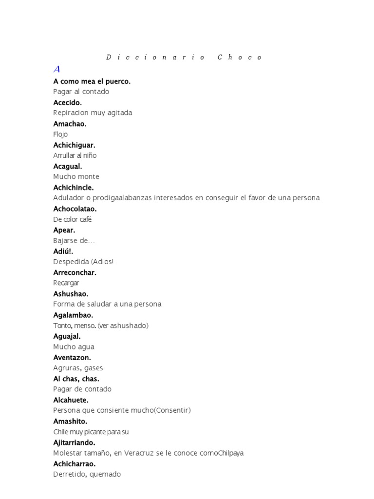A como mea el puerco. Pagar al contado Acecido. Repiracion muy agitada Amachao. Flojo Achichiguar. Arrullar al nio Acagual. Mucho monte Achichincle. Adulador o prodigaalabanzas interesados en conseguir el favor de una persona Achocolatao. De color caf Apear. Bajarse de Adi!. Despedida (Adios! Arreconchar. Recargar Ashushao. Forma de saludar a una persona Agalambao. Tonto, menso. (ver ashushado) Aguajal. Mucho agua Aventazon. Agruras, gases Al chas, chas. Pagar de contado Alcahuete. Persona que consiente mucho(Consentir) Amashito. Chile muy picante para su Ajitarriando. Molestar tamao, en Veracruz se le conoce comoChilpaya Achicharrao. Derretido, quemado