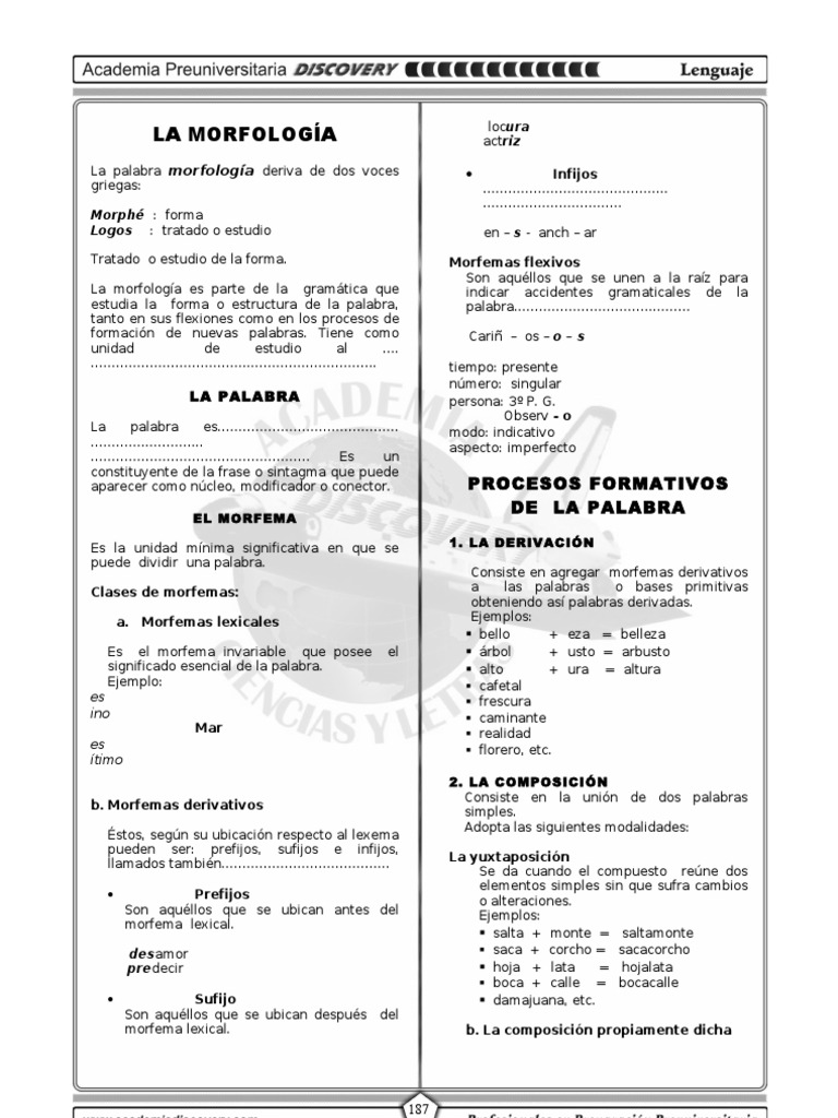 3. Qu palabra posee dos lexemas? celebrrimo ambicin conversacin excelente sacolargo 4. Es una palabra compuesta yuxtapuesta: coliflor padrenuestro desamor auriverde dominical 5. Qu palabra carece de prefijo? descontar replantear universitario desconectado proponer 6. Son palabras prefijadas, excepto: entretener sobreproduccin sinfn contrafuerte incrdulo