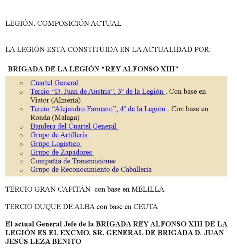 TERCIO GRAN CAPITN con base en MELILLA TERCIO DUQUE DE ALBA con base en CEUTA El actual General Jefe de la BRIGADA REY ALFONSO XIII DE LA LEGIN ES EL EXCMO. SR. GENERAL DE BRIGADA D. JUAN JESS LEZA BENITO
