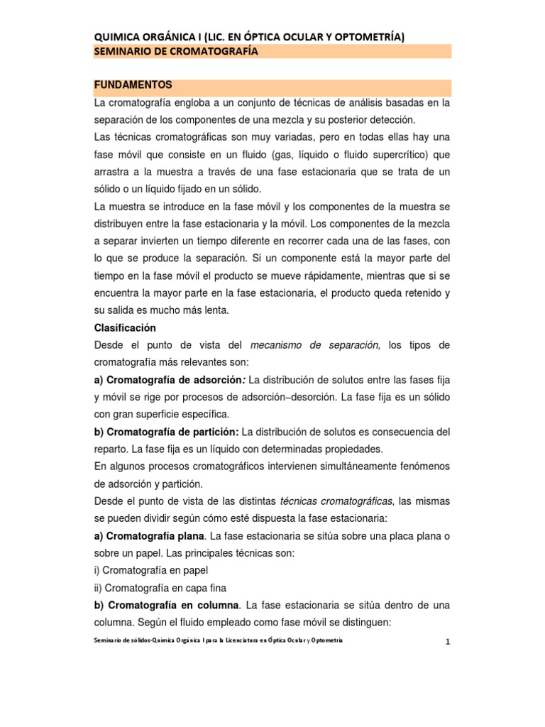 QUIMICA ORGNICA I (LIC. EN PTICA OCULAR Y OPTOMETRA) SEMINARIO DE CROMATOGRAFA