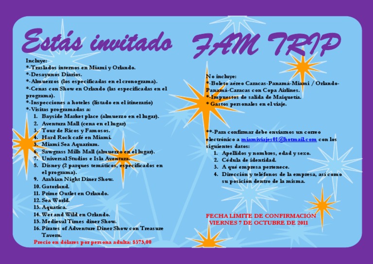 Incluye: *-Traslados internos en Miami y Orlando. *-Desayunos Diarios. *-Almuerzos (los especificadas en el cronograma). *-Cenas con Show en Orlando (las especificadas en el programa). *-Inspecciones a hoteles (listado en el itinerario) *-Visitas programadas a: 1. Bayside Market place (almuerzo en el lugar). 2. Aventura Mall (cena en el lugar) 3. Tour de Ricos y Famosos. 4. Hard Rock caf en Miami. 5. Miami Sea Aquarium. 6. Sawgrass Mills Mall (almuerzo en el lugar). 7. Universal Studios e Isla Aventura. 8. Disney (2 parques temticos, especificados en el programa). 9. Arabian Night Diner Show. 10. Gatorland. 11. Prime Outlet en Orlando. 12. Sea World. 13. Aquatica. 14. Wet and Wild en Orlando. 15. Medieval Times diner Show. 16. Pirates of Adventure Diner Show con Treasure Tavern. Precio en dlares por persona adulta: $375,00 No incluye: *-Boleto areo Caracas-Panam-Miami / OrlandoPanam-Caracas con Copa Airlines. *-Impuestos de salida de Maiqueta. * Gastos personales en el viaje. **-Para confirmar debe enviarnos un correo electrnico a miamiviajes01@hotmail.com con los siguientes datos: 1. Apellidos y nombres, edad y sexo. 2. Cdula de identidad. 3. A qu empresa pertenece. 4. Direccin y telfonos de la empresa, as como su posicin dentro de la misma.