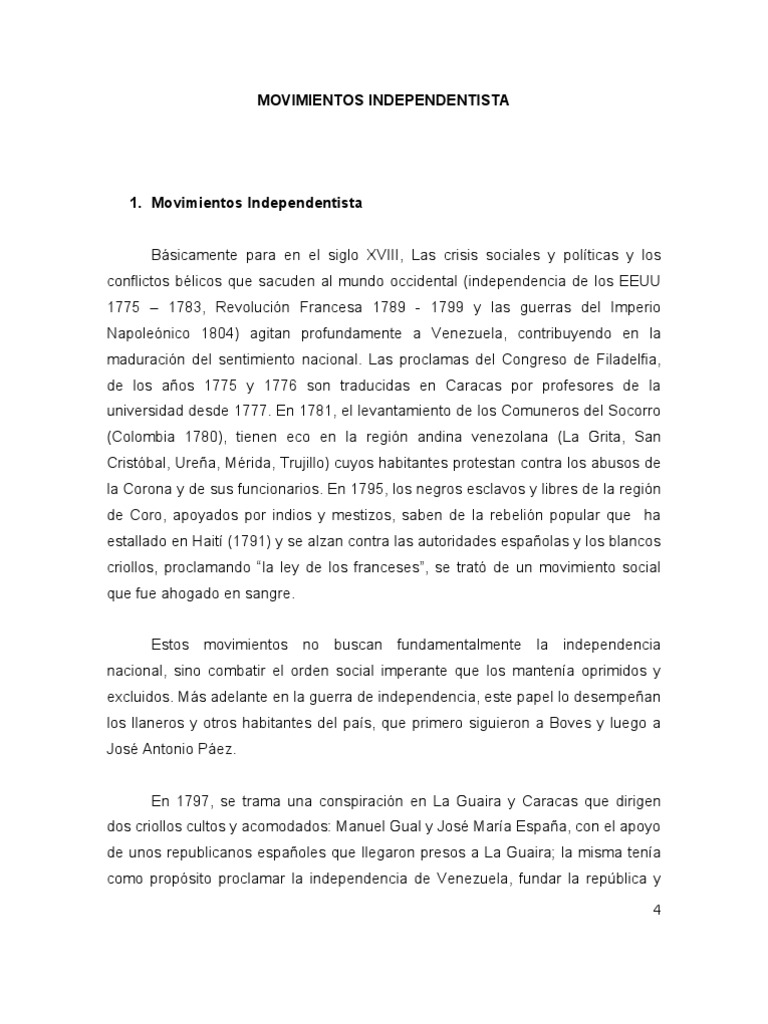 1. Movimientos Independentista Bsicamente para en el siglo XVIII, Las crisis sociales y polticas y los conflictos blicos que sacuden al mundo occidental (independencia de los EEUU 1775 1783, Revolucin Francesa 1789 - 1799 y las guerras del Imperio Napolenico 1804) agitan profundamente a Venezuela, contribuyendo en la maduracin del sentimiento nacional. Las proclamas del Congreso de Filadelfia, de los aos 1775 y 1776 son traducidas en Caracas por profesores de la universidad desde 1777. En 1781, el levantamiento de los Comuneros del Socorro (Colombia 1780), tienen eco en la regin andina venezolana (La Grita, San Cristbal, Urea, Mrida, Trujillo) cuyos habitantes protestan contra los abusos de la Corona y de sus funcionarios. En 1795, los negros esclavos y libres de la regin de Coro, apoyados por indios y mestizos, saben de la rebelin popular que ha estallado en Hait (1791) y se alzan contra las autoridades espaolas y los blancos criollos, proclamando la ley de los franceses, se trat de un movimiento social que fue ahogado en sangre. Estos movimientos no buscan fundamentalmente la independencia nacional, sino combatir el orden social imperante que los mantena oprimidos y excluidos. Ms adelante en la guerra de independencia, este papel lo desempean los llaneros y otros habitantes del pas, que primero siguieron a Boves y luego a Jos Antonio Pez. En 1797, se trama una conspiracin en La Guaira y Caracas que dirigen dos criollos cultos y acomodados: Manuel Gual y Jos Mara Espaa, con el apoyo de unos republicanos espaoles que llegaron presos a La Guaira; la misma tena como propsito proclamar la independencia de Venezuela, fundar la repblica y