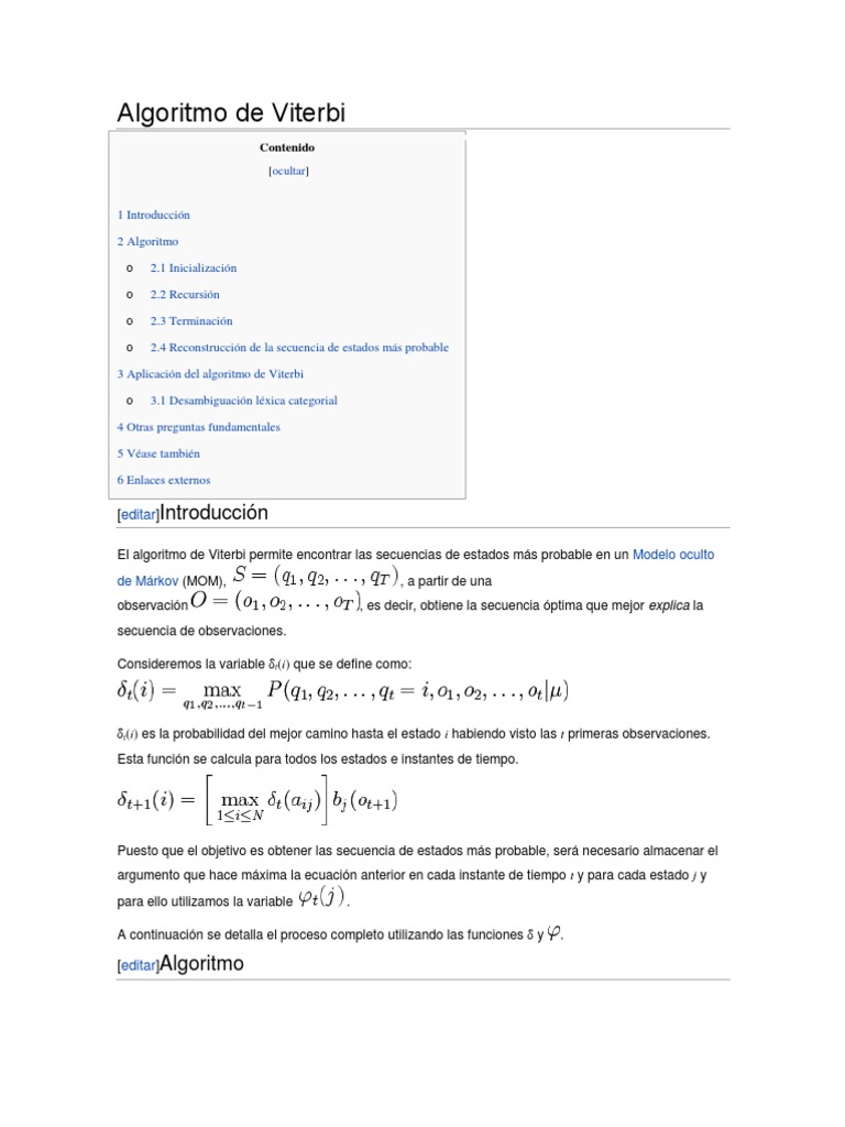 El algoritmo de Viterbi permite encontrar las secuencias de estados ms probable en un Modelo oculto de Mrkov (MOM), observacin secuencia de observaciones. Consideremos la variable t(i) que se define como: , a partir de una , es decir, obtiene la secuencia ptima que mejor explica la