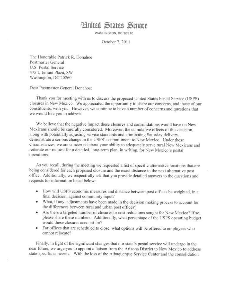 Bingaman-Udall Letter to Postmaster General on Pos...