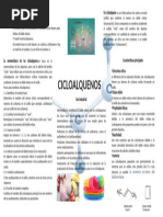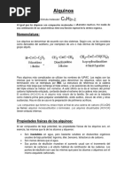 ALQUENOS CARACTERSTICAS GENERALES El grupo de los alquenos u olefinas est formado por hidrocarburos de cadena abierta en los que existe un doble enlace entre dos tomos de carbono. La frmula general del grupo es CnH2n, donde n es el nmero de tomos de carbono. Al igual que los alcanos, los miembros ms bajos son gases, los compuestos intermedios son lquidos y los ms altos son slidos. Los compuestos del grupo de los alquenos son ms reactivos qumicamente que los compuestos saturados. Reaccionan fcilmente con sustancias como los halgenos, adicionando tomos de halgeno a los dobles enlaces. No se encuentran en los productos naturales, pero se obtienen en la destilacin destructiva de sustancias naturales complejas, como el carbn, y en grandes cantidades en las refineras de petrleo, especialmente en el proceso de craqueo.