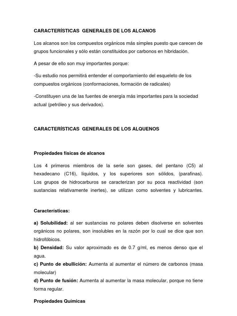 CARACTERSTICAS GENERALES DE LOS ALCANOS Los alcanos son los compuestos orgnicos ms simples puesto que carecen de grupos
