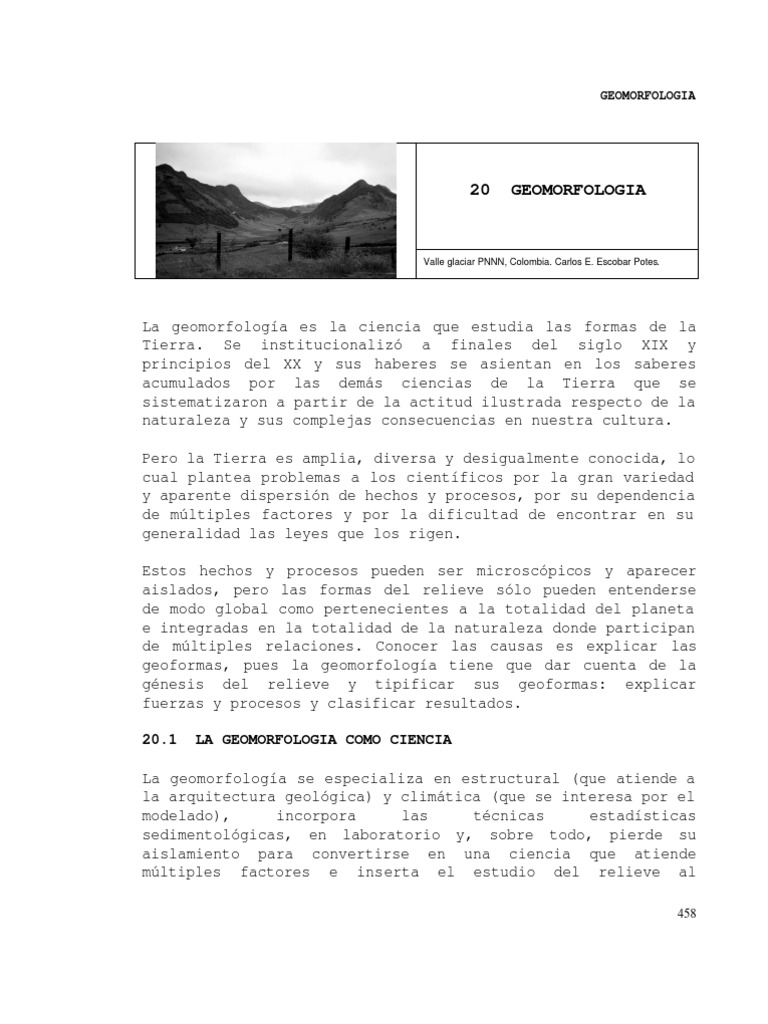 La geomorfologa es la ciencia que estudia las formas de la Tierra. Se institucionaliz a finales del siglo XIX y principios del XX y sus haberes se asientan en los saberes acumulados por las dems ciencias de la Tierra que se sistematizaron a partir de la actitud ilustrada respecto de la naturaleza y sus complejas consecuencias en nuestra cultura. Pero la Tierra es amplia, diversa y desigualmente conocida, lo cual plantea problemas a los cientficos por la gran variedad y aparente dispersin de hechos y procesos, por su dependencia de mltiples factores y por la dificultad de encontrar en su generalidad las leyes que los rigen. Estos hechos y procesos pueden ser microscpicos y aparecer aislados, pero las formas del relieve slo pueden entenderse de modo global como pertenecientes a la totalidad del planeta e integradas en la totalidad de la naturaleza donde participan de mltiples relaciones. Conocer las causas es explicar las geoformas, pues la geomorfologa tiene que dar cuenta de la gnesis del relieve y tipificar sus geoformas: explicar fuerzas y procesos y clasificar resultados. 20.1 LA GEOMORFOLOGIA COMO CIENCIA