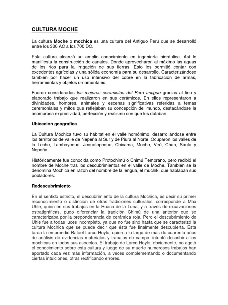 La cultura Moche o mochica es una cultura del Antiguo Per que se desarroll entre los 300 AC a los 700 DC. Esta cultura alcanz un amplio conocimiento en ingeniera hidrulica. As lo manifiesta la construccin de canales. Donde aprovecharon al mximo las aguas de los ros para la irrigacin de sus tierras. Esto les permiti contar con excedentes agrcolas y una slida economa para su desarrollo. Caracterizndose tambin por hacer un uso intensivo del cobre en la fabricacin de armas, herramientas y objetos ornamentales. Fueron considerados los mejores ceramistas del Per antiguo gracias al fino y elaborado trabajo que realizaron en sus cermicos. En ellos representaron a divinidades, hombres, animales y escenas significativas referidas a temas ceremoniales y mitos que reflejaban su concepcin del mundo, destacndose la asombrosa expresividad, perfeccin y realismo con que los dotaban. Ubicacin geogrfica La Cultura Mochica tuvo su hbitat en el valle homnimo, desarrollndose entre los territorios de valle de Nepea al Sur y de Piura al Norte. Ocuparon los valles de la Leche, Lambayeque, Jequetepeque, Chicama, Moche, Vir, Chao, Santa y Nepea. Histricamente fue conocida como Protochim o Chim Temprano, pero recibi el nombre de Moche tras los descubrimientos en el valle de Moche. Tambin se la denomina Mochica en razn del nombre de la lengua, el muchik, que hablaban sus pobladores. Redescubrimiento En el sentido estricto, el descubrimiento de la cultura Mochica, es decir su primer reconocimiento o distincin de otras tradiciones culturales, corresponde a Max Uhle, quien en sus trabajos en la Huaca de la Luna, y a travs de excavaciones estratigrficas, pudo diferenciar la tradicin Chim de una anterior que se caracterizaba por la preponderancia de cermica roja. Pero el descubrimiento de Uhle fue a todas luces incompleto, ya que no fue sino hasta que se caracteriz la cultura Mochica que se puede decir que sta fue finalmente descubierta. Esta tarea la emprendi Rafael Larco Hoyle, quien a lo largo de ms de cuarenta aos de anlisis de evidencias materiales y trabajos de campo, intent describir a los mochicas en todos sus aspectos. El trabajo de Larco Hoyle, obviamente, no agot el conocimiento sobre esta cultura y luego de su muerte numerosos trabajos han aportado cada vez ms informacin, a veces complementando o documentando ciertas intuiciones, otras rectificando errores.