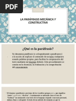 5.1 La parfrasis Mecnica: Que consiste en sustituir las expresiones de un texto por sinnimos o por frases alternas, cambiando apenas su estructura sintctica. (en este tipo de parfrasis cambias cada palabra clave por un sinnimo). 5.2 La parfrasis constructiva: Se reelabora el enunciado expresndolo con otro de caractersticas sintcticas muy distintas, por lo que su extensin vara de la cantidad de palabras del original; y se va dando origen a otro con caractersticas muy distintas, pero conservando el mismo significado o contenido, su esencia, hacindolos ms inteligible, claro y preciso.