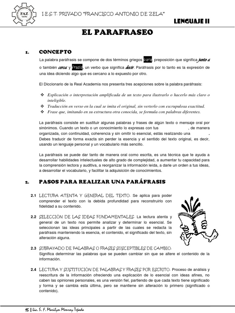 La parfrasis consiste en sustituir algunas palabras y frases de algn texto o mensaje oral por sinnimos. Cuando un texto o un conocimiento lo expresas con tus propias palabras, de manera organizada, con continuidad, coherencia y sin omitir lo esencial, ests realizando una parfrasis. Debes traducir de forma exacta sin perder la esencia y el sentido del texto original, es decir, usando un lenguaje personal y un vocabulario ms sencillo. La parfrasis se puede dar tanto de manera oral como escrita, es una tcnica que te ayuda a desarrollar habilidades intelectuales de alto grado de complejidad, a aumentar tu capacidad para la comprensin lectora y auditiva, a reorganizar la informacin leda, a darle un orden a tus ideas, a desarrollar el vocabulario, y facilitar la adquisicin de conocimientos.