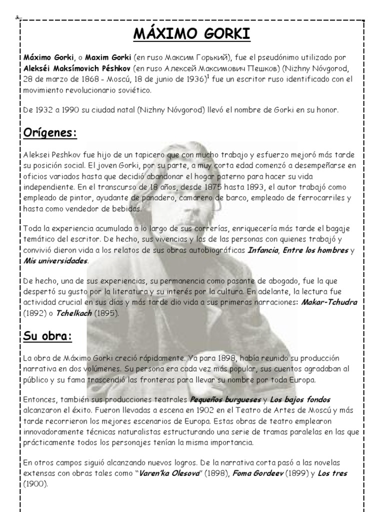 Mximo Gorki, o Maxim Gorki (en ruso ), fue el pseudnimo utilizado por Aleksi Maksmovich Pshkov (en ruso ) (Nizhny Nvgorod, 28 de marzo de 1868 - Mosc, 18 de junio de 1936)1 fue un escritor ruso identificado con el movimiento revolucionario sovitico. De 1932 a 1990 su ciudad natal (Nizhny Nvgorod) llev el nombre de Gorki en su honor.