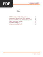 El rea Buffer de pantalla permite configurar el nmero de caracteres que se pueden mostrar en una lnea (Buffer Width) y el nmero de lneas por pantalla (Buffer Length). Debido a que SQL es el lenguaje que utilizaremos para interactuar con el SGBD, es importante unificar los conocimientos de SQL. Para ello los prximos temas sern dedicados a la sintaxis SQL tanto como DDL como DML. 2. Fundamentos SQL Lenguaje de Definicin de Datos (DDL): proporciona rdenes para definir, modificar o eliminar los distintos objetos de la base de datos (tablas, vistas, ndices...). Lenguaje de Manipulacin de Datos (DML): proporciona rdenes para insertar, suprimir y modificar datos de las tablas de la base de datos. 3. Lenguaje de Definicin de Datos Se utilizan las sentencias CREATE, ALTER, DROP, crear, modificar y borrar cualquier objeto de la base de datos. A continuacin se muestran una serie de ejemplos de uso de estas sentencias. Nota: Para poder facilitar el uso de estas sentencias, en el anexo 1 figura el manual de sql reference de oracle.