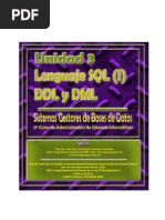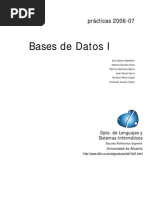producirse ningn error. La conversin de tipos explcita se realiza bsicamente con las siguientes funciones: Conversin nmero-cadena: TO_CHAR(nmero [, formato]). Conversin cadena-nmero: TO_NUMBER(cadena [,formato]). Conversin fecha-cadena: TO_CHAR(fecha [, formato]). Conversin cadena-fecha: TO_DATE(cadena [, formato]). La opcin formato permite especificar un modelo de formato o mscara consistente en una cadena de caracteres que describe el formato en el que se quiere obtener el resultado o en el que se da el parmetro. Algunos ejemplos de la utilizacin de estas funciones son: TO_CHAR('25-dec-98', 'YY') devuelve '98'. TO_CHAR(SYSDATE, 'dd-mon-yyyy') devuelve '25-dec-1998'. TO_CHAR(123.34,'09999.999') devuelve '00123.340' 6. Lenguaje de Manipulacin de Datos Se utilizan las sentencias SELECT, INSERT, UPDATE, DELETE, consulta, insercin, actualizacin y borrado de los datos de la tabla dnde se aplique. Insercin, modificacin y eliminacin de DATOS Una vez que se ha creado de forma conveniente las tablas, el siguiente paso consiste en insertar datos en ellas, es decir, aadir registros. Durante la vida de la base de datos ser necesario, adems, borrar determinados registros o modificar los valores que contienen. Los comandos de SQL que se van a estudiar en este apartado son INSERT, UPDATE y DELETE.
