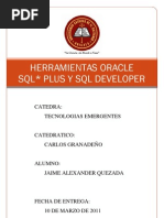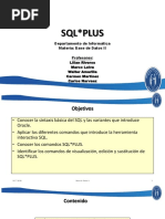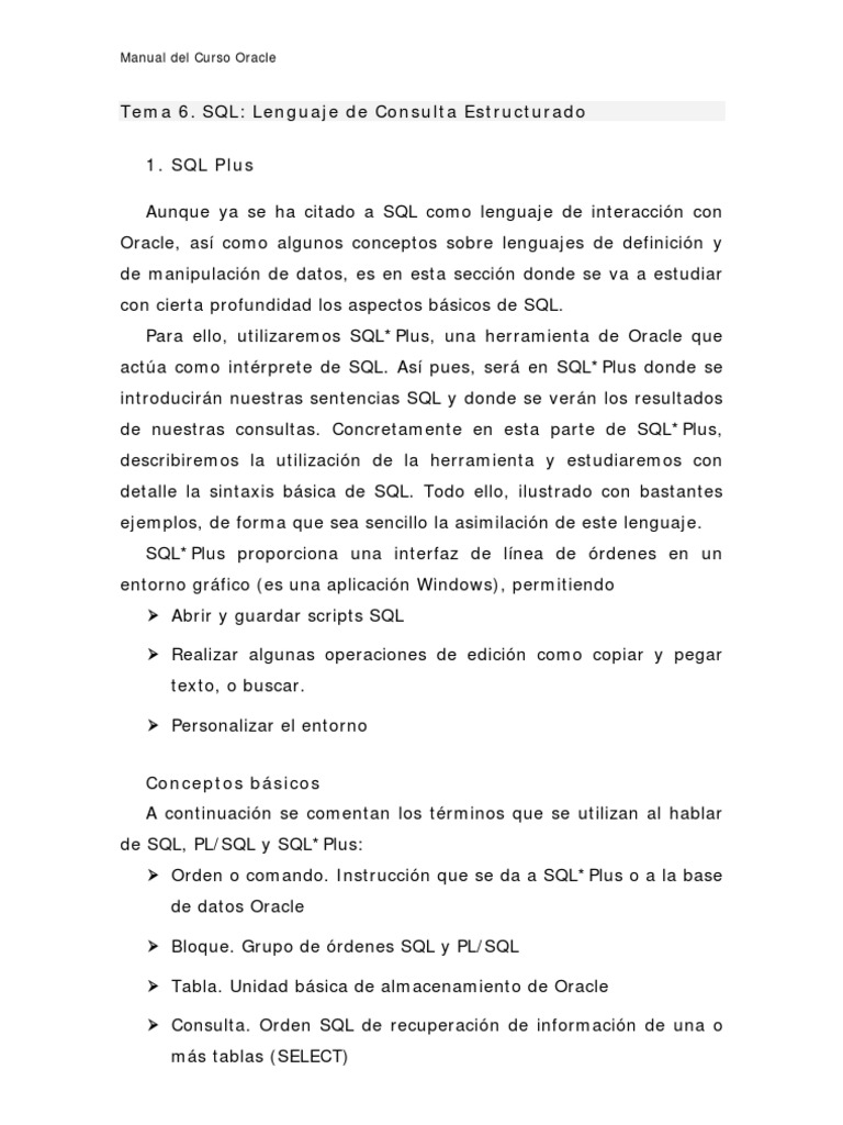 Tema 6. SQL: Lenguaje de Consulta Estructurado 1. SQL Plus Aunque ya se ha citado a SQL como lenguaje de interaccin con Oracle, as como algunos conceptos sobre lenguajes de definicin y de manipulacin de datos, es en esta seccin donde se va a estudiar con cierta profundidad los aspectos bsicos de SQL. Para ello, utilizaremos SQL*Plus, una herramienta de Oracle que acta como intrprete de SQL. As pues, ser en SQL*Plus donde se introducirn nuestras sentencias SQL y donde se vern los resultados de nuestras consultas. Concretamente en esta parte de SQL*Plus, describiremos la utilizacin de la herramienta y estudiaremos con detalle la sintaxis bsica de SQL. Todo ello, ilustrado con bastantes ejemplos, de forma que sea sencillo la asimilacin de este lenguaje. SQL*Plus proporciona una interfaz de lnea de rdenes en un entorno grfico (es una aplicacin Windows), permitiendo Abrir y guardar scripts SQL Realizar algunas operaciones de edicin como copiar y pegar texto, o buscar. Personalizar el entorno Conceptos bsicos A continuacin se comentan los trminos que se utilizan al hablar de SQL, PL/SQL y SQL*Plus: Orden o comando. Instruccin que se da a SQL*Plus o a la base de datos Oracle Bloque. Grupo de rdenes SQL y PL/SQL Tabla. Unidad bsica de almacenamiento de Oracle Consulta. Orden SQL de recuperacin de informacin de una o ms tablas (SELECT)
