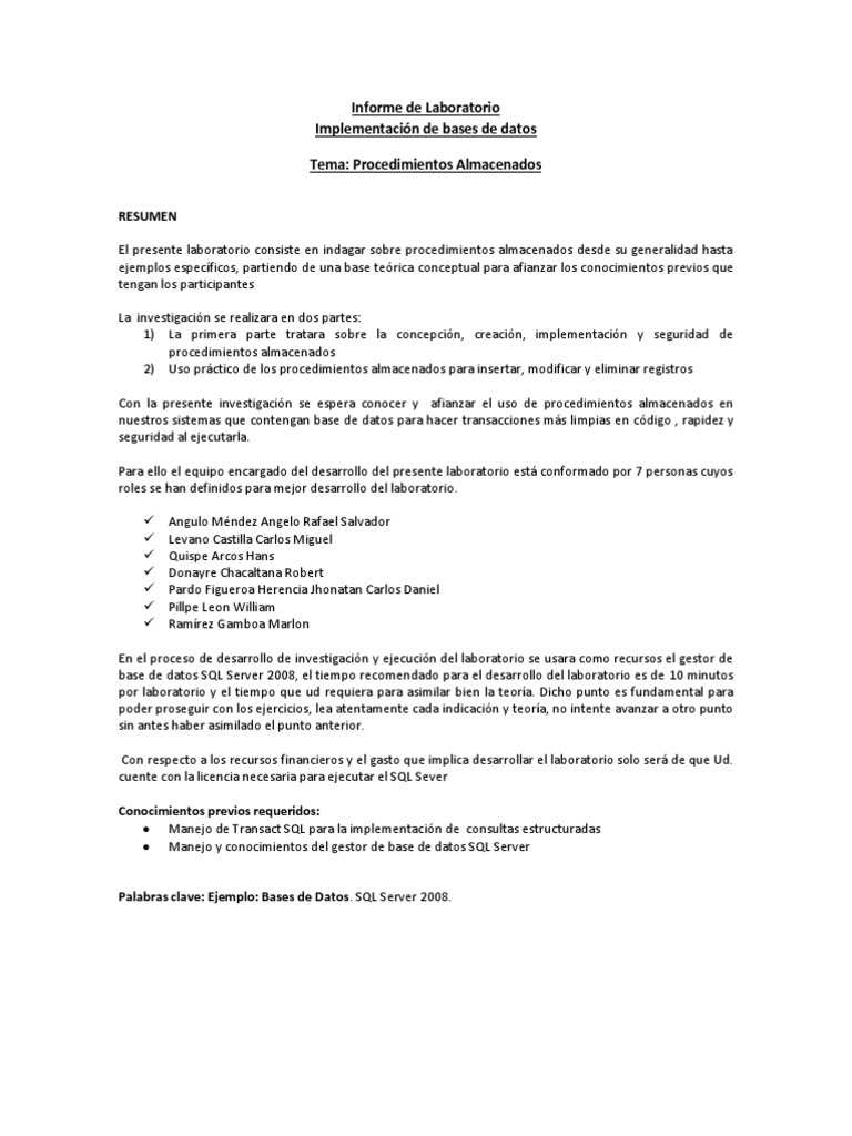 RESUMEN El presente laboratorio consiste en indagar sobre procedimientos almacenados desde su generalidad hasta ejemplos especficos, partiendo de una base terica conceptual para afianzar los conocimientos previos que tengan los participantes La investigacin se realizara en dos partes: 1) La primera parte tratara sobre la concepcin, creacin, implementacin y seguridad de procedimientos almacenados 2) Uso prctico de los procedimientos almacenados para insertar, modificar y eliminar registros Con la presente investigacin se espera conocer y afianzar el uso de procedimientos almacenados en nuestros sistemas que contengan base de datos para hacer transacciones ms limpias en cdigo , rapidez y seguridad al ejecutarla. Para ello el equipo encargado del desarrollo del presente laboratorio est conformado por 7 personas cuyos roles se han definidos para mejor desarrollo del laboratorio. Angulo Mndez Angelo Rafael Salvador Levano Castilla Carlos Miguel Quispe Arcos Hans Donayre Chacaltana Robert Pardo Figueroa Herencia Jhonatan Carlos Daniel Pillpe Leon William Ramrez Gamboa Marlon