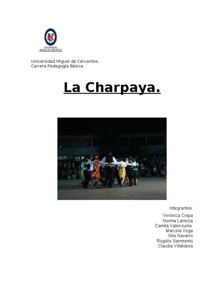 Vocablo quechua que tiene como significado: despedida. Danza colectiva de recorrido formando hileras tomados de las manos, manteniendo siempre figuras de caracol, crculos y formas serpenteadas la cacharpaya goza de plena vigencia social. Origen Pertenece a la familia del gnero huayno. De tal manera que es muy probable que su origen sea precolombino. Existen numerosas versiones locales y regionales. Danza colectiva, de recorrido, en hilera, tomados de la mano. En algunos lugares es danza de pareja mixta enlazada. Mantiene figuras: de caracol, circulo, forma serpenteada. Dispersin Geogrfica Preferentemente en precordillera y altiplano de las regiones de Tarapac y Antofagasta. Actualmente, aparece adscrita en las grandes fiestas ceremoniales, como: Tirana y Ayquina. Las cofradas o hermandades se despiden el ltimo da del santuario, bailando y cantando una cacharpaya o cacharpayita. Existe una versin local cantada (Pica- Beln). Forma Literaria Variable, predominando los textos en castellano, con algunas palabras de origen indgena (quechua, aymara). Cuartetas octoslabas con estribillo intercalado.