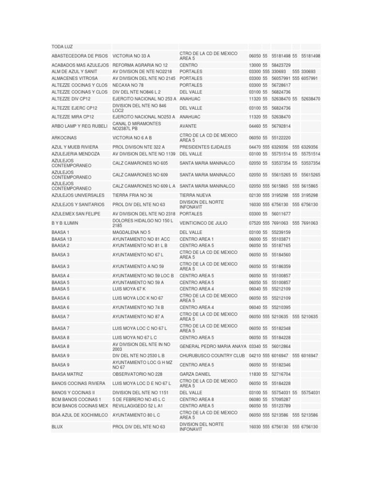 ACABADOS MAS AZULEJOS REFORMA AGRARIA NO 12 ALM DE AZUL Y SANIT ALMACENES VITROSA ALTEZZE COCINAS Y CLOS ALTEZZE COCINAS Y CLOS ALTEZZE DIV CP12 ALTEZZE EJERC CP12 ALTEZZE MIRA CP12 ARBO LAMP Y REG RUBELI ARKOCINAS AZUL Y MUEB RIVIERA AZULEJERIA MENDOZA AZULEJOS CONTEMPORANEO AZULEJOS CONTEMPORANEO AZULEJOS CONTEMPORANEO AZULEJOS UNIVERSALES AZULEJOS Y SANITARIOS AZULEMEX SAN FELIPE B Y B ILUMIN BAASA 1 BAASA 13 BAASA 2 BAASA 3 BAASA 3 BAASA 4 BAASA 5 BAASA 5 BAASA 6 BAASA 6 BAASA 7 BAASA 7 BAASA 8 BAASA 8 BAASA 9 BAASA 9 BAASA MATRIZ BANOS COCINAS RIVIERA BANOS Y COCINAS II BCM BANOS COCINAS 1 BCM BANOS COCINAS MEX BGA AZUL DE XOCHIMILCO BLUX AV DIVISION DE NTE NO2218 AV DIVISION DEL NTE NO 2145 NECAXA NO 78 DIV DEL NTE NO846 L 2 DIVISION DEL NTE NO 846 LOC2 EJERCITO NACIONAL NO253 A CANAL D MIRAMONTES NO2387L PB VICTORIA NO 6 A B PROL DIVISON NTE 322 A AV DIVISION DEL NTE NO 1139 CALZ CAMARONES NO 605 CALZ CAMARONES NO 609 CALZ CAMARONES NO 609 L A TIERRA FRIA NO 36 PROL DIV DEL NTE NO 63 AV DIVISION DEL NTE NO 2318 DOLORES HIDALGO NO 150 L 2185 MAGDALENA NO 5 AYUNTAMIENTO NO 81 ACC AYUNTAMIENTO NO 81 L B AYUNTAMIENTO NO 67 L AYUNTAMIENTO A NO 59 AYUNTAMIENTO NO 59 LOC B AYUNTAMIENTO NO 59 A LUIS MOYA 67 K LUIS MOYA LOC K NO 67 AYUNTAMIENTO NO 74 B AYUNTAMIENTO NO 87 A LUIS MOYA LOC C NO 67 L LUIS MOYA NO 67 L C AV DIVISION DEL NTE IN NO 2003 DIV DEL NTE NO 2530 L B AYUNTAMIENTO LOC G H MZ NO 67 OBSERVATORIO NO 228 LUIS MOYA LOC D E NO 67 L DIVISION DEL NTE NO 1151 5 DE FEBRERO NO 45 L C REVILLAGIGEDO 52 L A1 AYUNTAMIENTO 80 L C PROL DIV DEL NTE NO 63